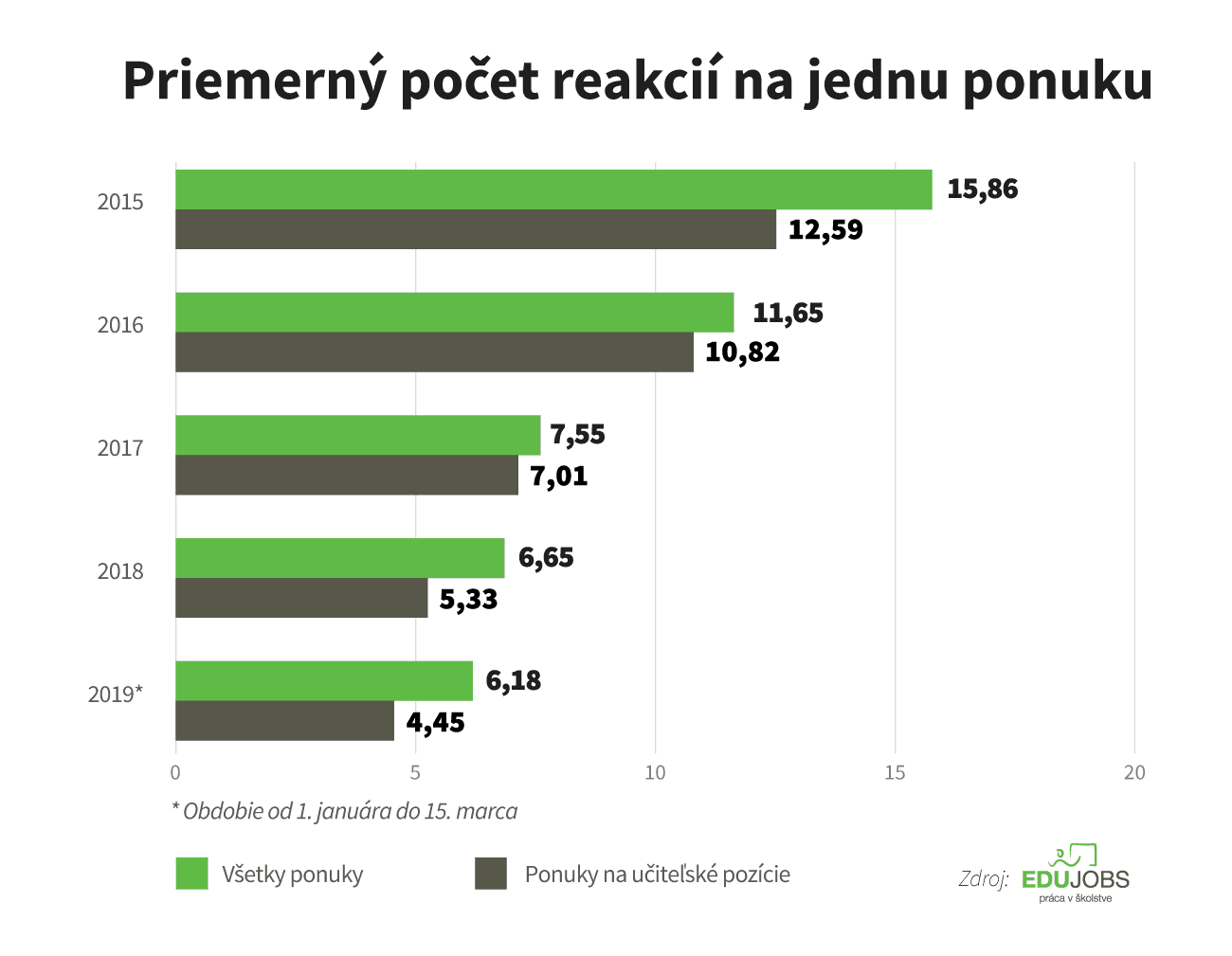 Bohužiaľ, v súčasnosti sa ukazuje, že viac pracovných príležitostí v školstve neprináša tiež väčší záujem uchádzačov o tieto pozície. Práve naopak. V roku 2015 zareagovalo na jednu pracovnú ponuku na Edujobs.sk v priemere takmer 16 uchádzačov. Dnes sa počet priemerných reagujúcich ľudí zúžil na 6.