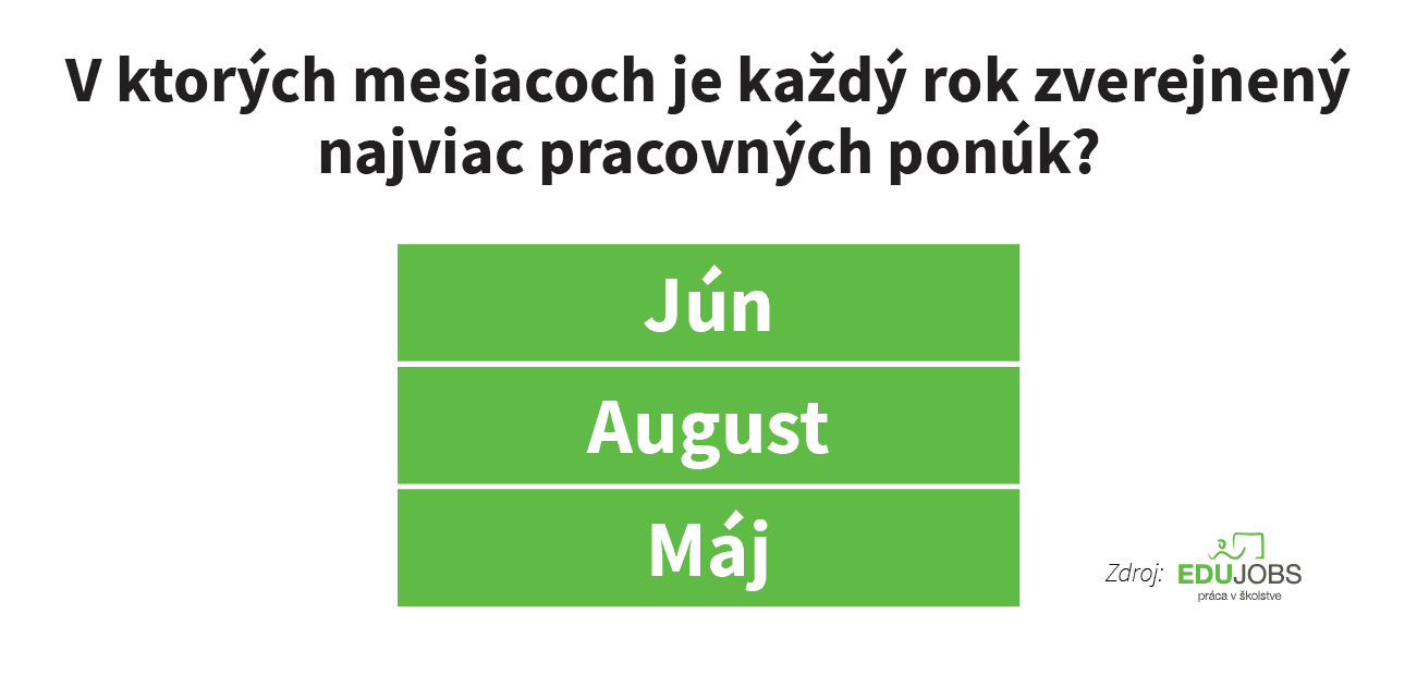 Portál Edujobs.sk tiež pozrel na to, v ktorých mesiacoch hľadajú školy nových ľudí. Ukazuje sa, že v prípade uverejňovania pracovných ponúk v školstve sú každý rok rovnaké trendy.