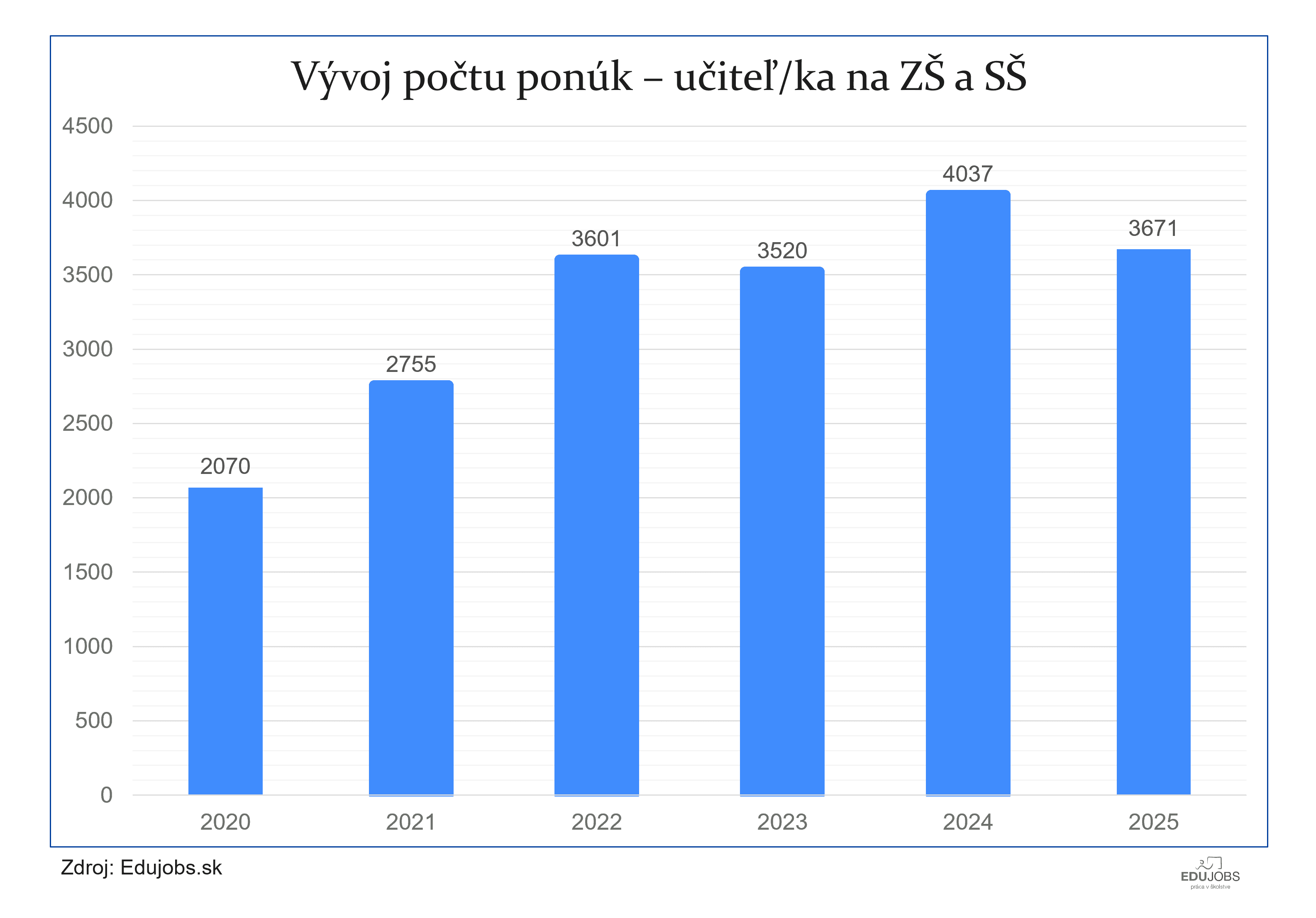 V roku 2025 zverejnili školy na portáli Edujobs 8 740 pracovných ponúk, čo síce predstavuje medziročný pokles o vyše 1 000 inzerátov, no ide o rok s druhým najväčším množstvom ponúk v histórii portálu. Najväčší dopyt bol po pedagogických zamestnancoch. Pracovných ponúk na učiteľov na základné a stredné školy bolo zverejnených 3 671, čo predstavuje pokles o 8 %.