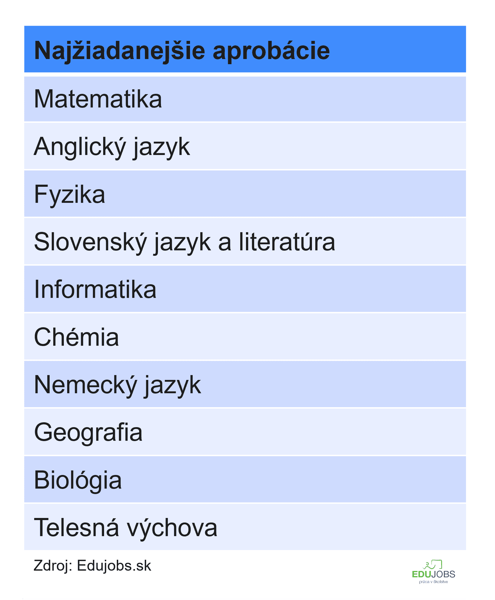 Školám najviac chýbali učitelia a učiteľky matematiky, vlani ich hľadali 678-krát. O 60 ponúk menej bolo na učiteľov anglického jazyka. Nasledujú učitelia fyziky, slovenského jazyka a literatúry a informatiky.