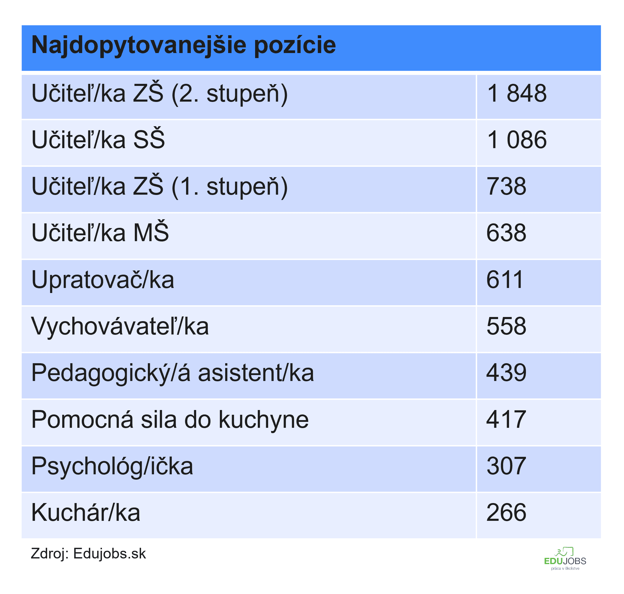 Okrem učiteľských pozícií mali školy vlani veľký záujem aj o nové upratovačky, ktoré hľadali viac ako 600-krát, tiež o vychovávateľky, pedagogických asistentov či pomocné sily do kuchyne.