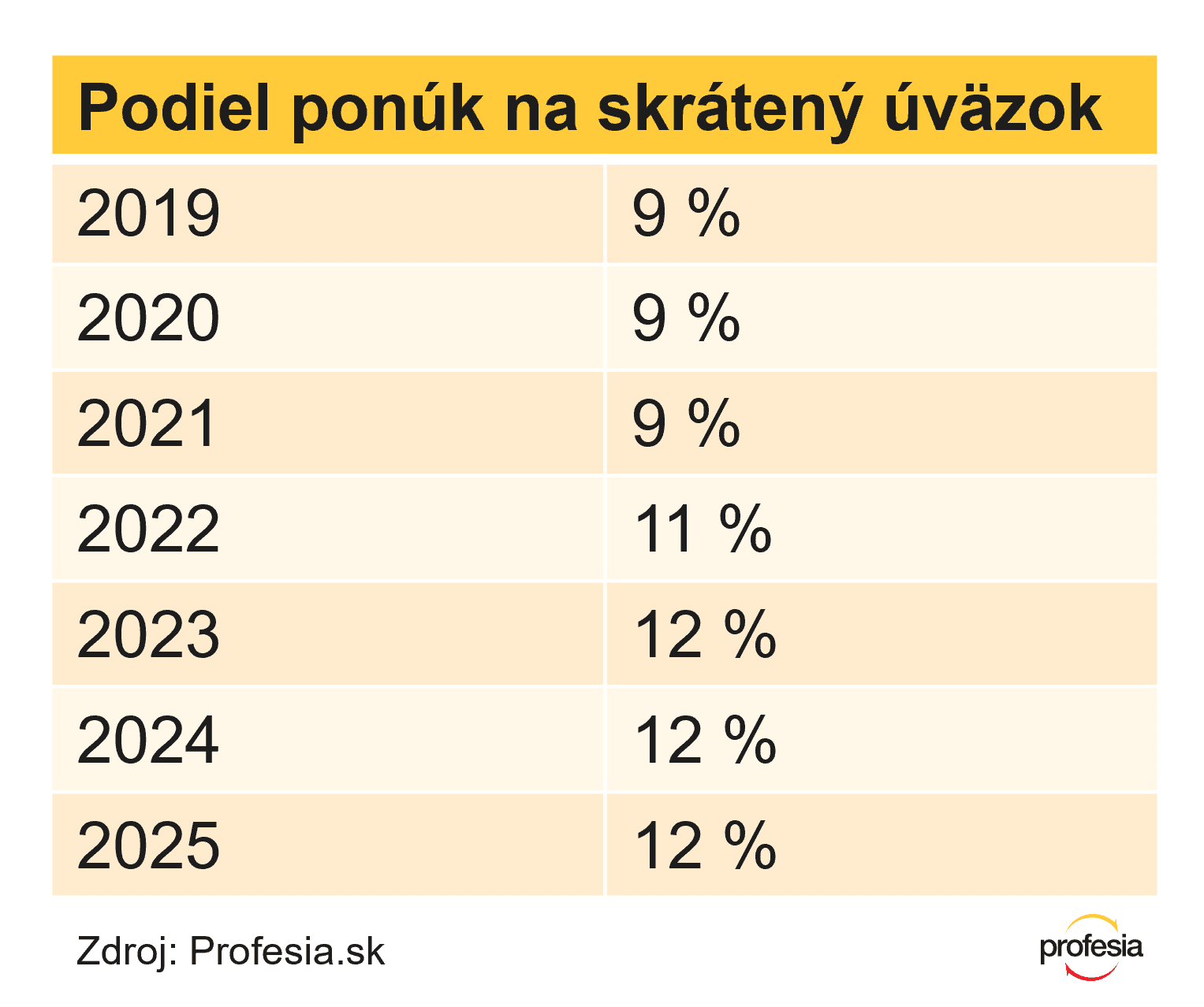 Zamestnávatelia však ponúkajú prácu na skrátený úväzok len zriedka. Za posledné 3 roky tvorili inzeráty s možnosťou práce na skrátený úväzok 12 percent pracovných ponúk na portáli Profesia.sk. V roku 2021 to nebola ani desatina.