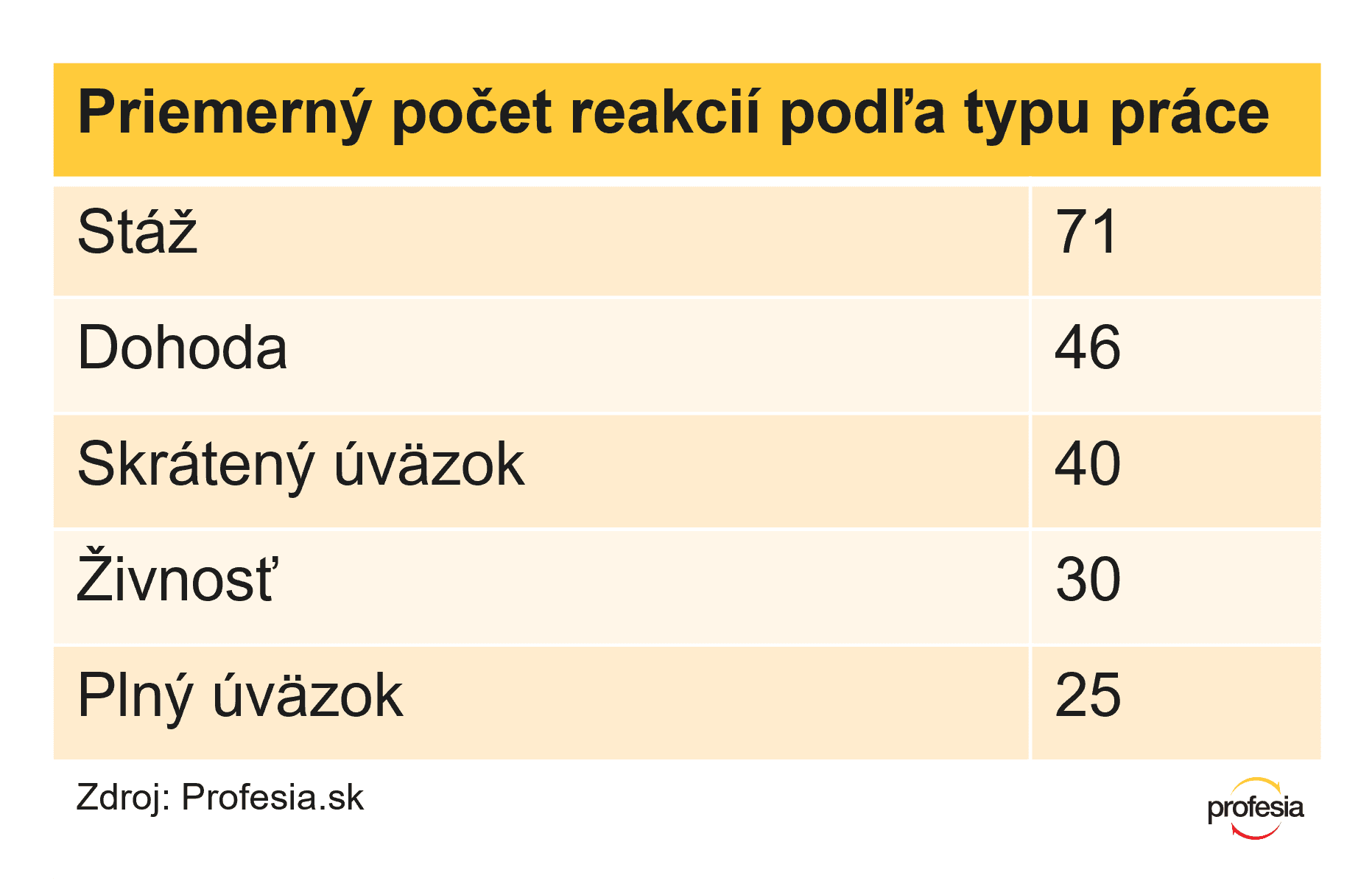 Priemerný počet reakcií na ponuky na plný úväzok na Profesia.sk je tento rok 25, v prípade inzerátov na skrátený úväzok až 40. Nadpriemerný záujem je dlhodobý.