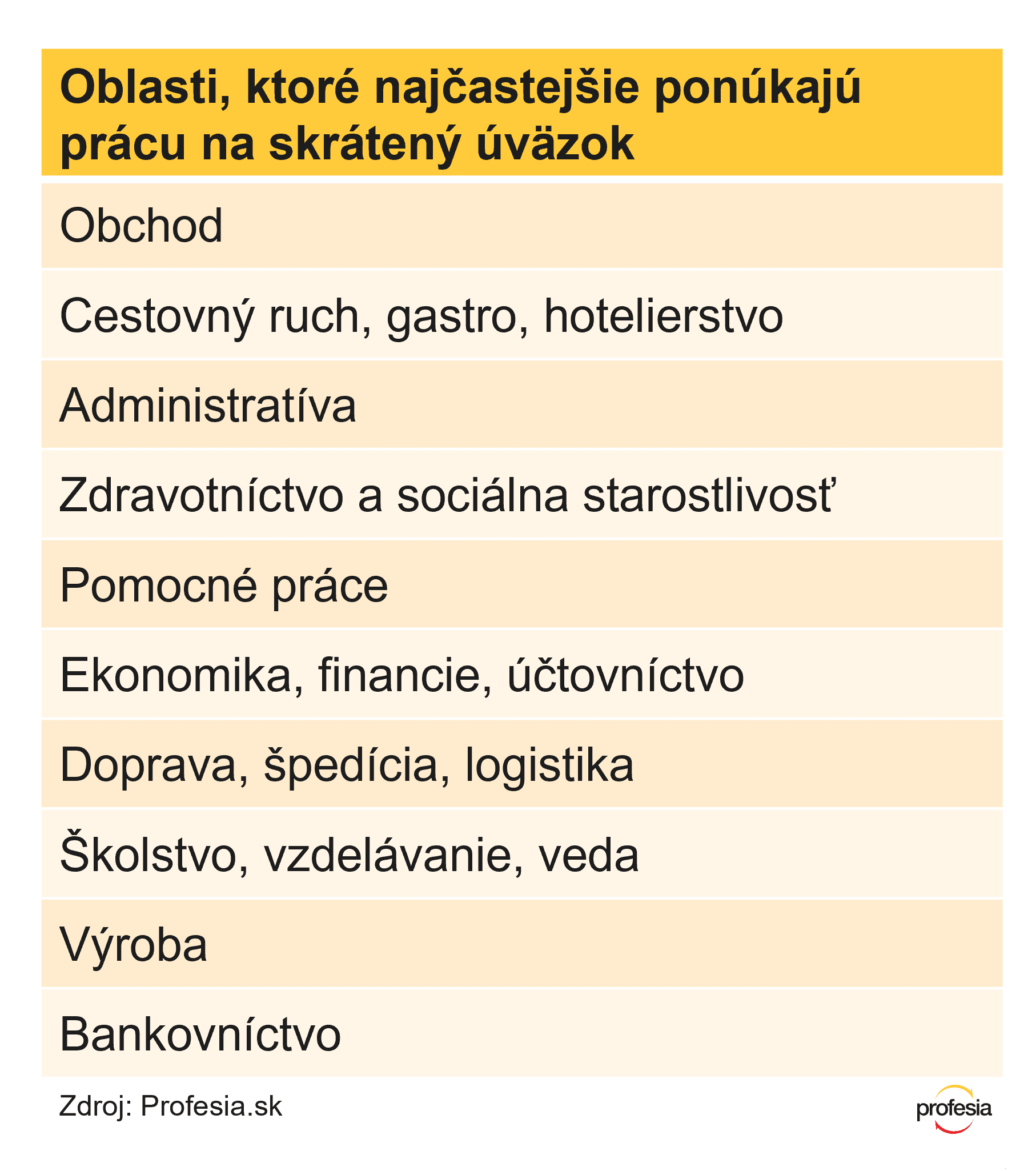 Ponuky práce na skrátený úväzok sú najčastejšie na pozície predavač, pokladník, administratívny pracovník, čašník a odborný predajca.