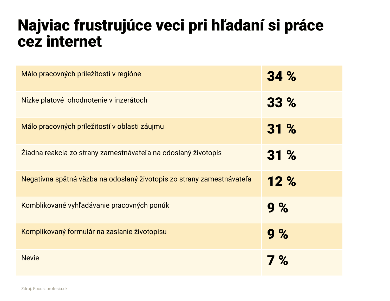 Málo pracovných príležitostí v ich regióne či nízke platové ohodnotenie v pracovných inzerátoch. Tieto dve veci uvádzali respondenti ako najviac frustrujúce pri hľadaní si nového uplatnenia.