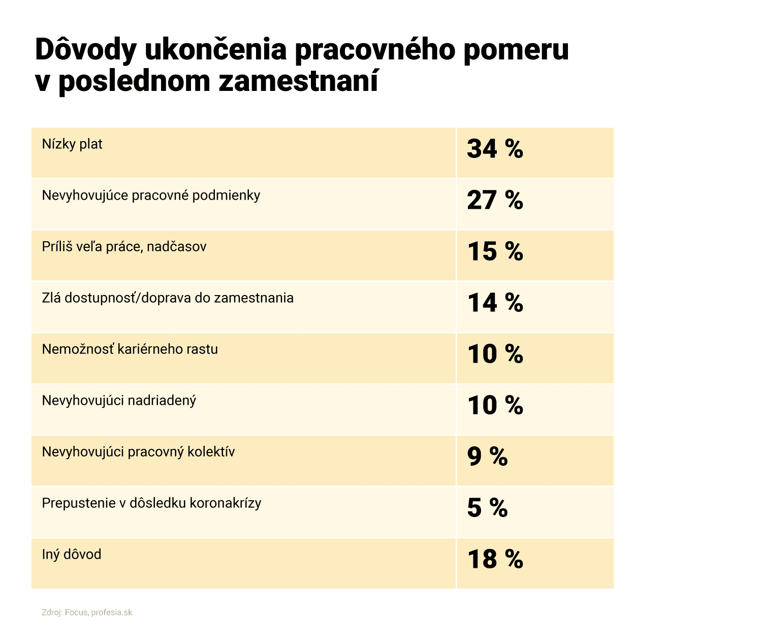 Najčastejším dôvodom ukončenia pracovného pomeru je v našich končinách nespokojnosť s platom. Takúto odpoveď uviedla vyše tretina respondentov. Tento dôvod uvádzali ľudia najčastejšie v každom jednom kraji na Slovensku.