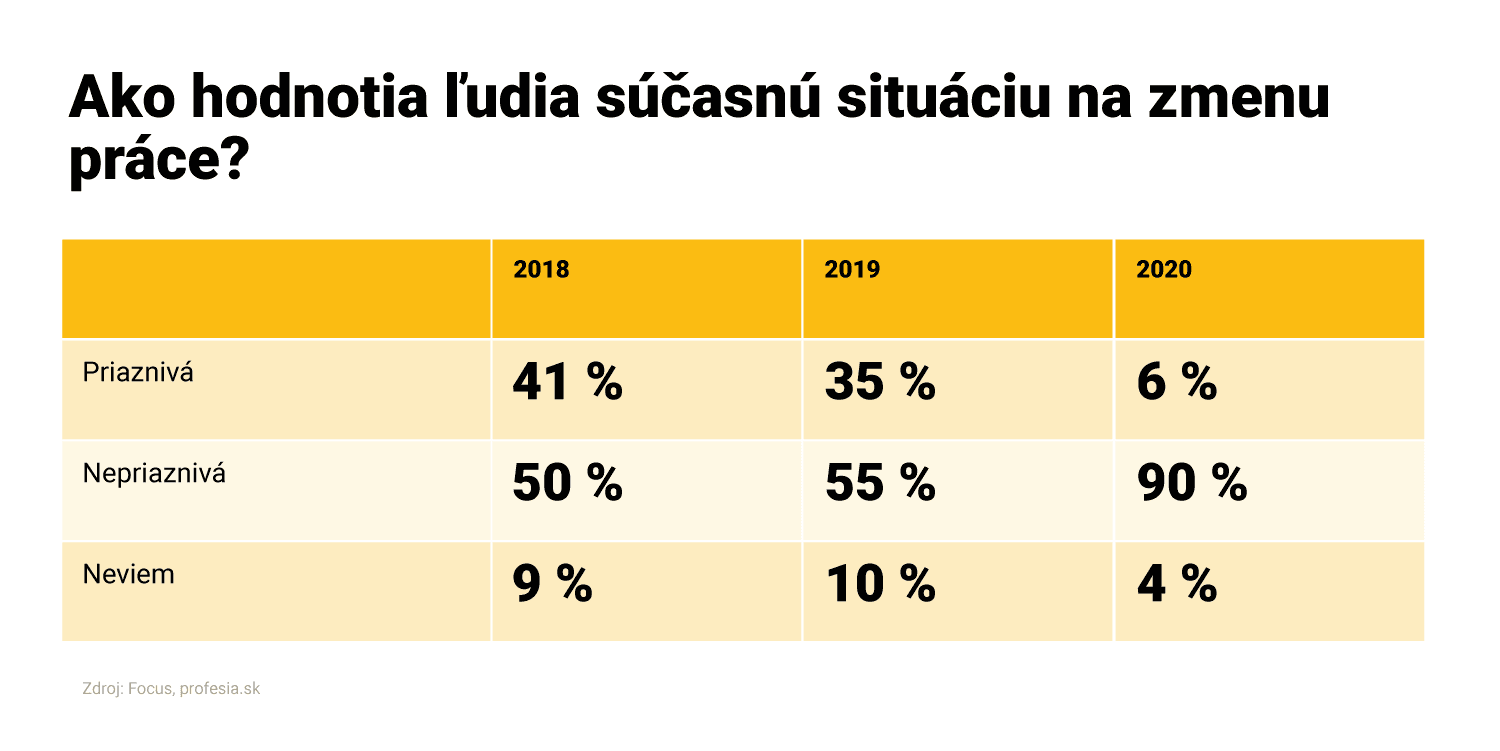 Priaznivú situáciu na zmenu práce vidí v roku 2020 len málokto. Kým vlani išlo o 35 percent ľudí, v roku, ktorý výrazne poznačila koronakríza, sa tento podiel znížil iba na šesť percent.