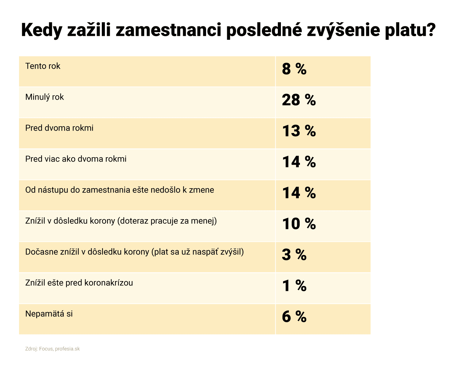 Posledné zvýšenie platov zažila väčšina zamestnancov na Slovensku vlani. Takúto odpoveď uviedlo 28 percent respondentov, ďalších 13 percent uviedlo, že si platovo polepšili naposledy v roku 2018, 14 percent Slovákov zažila vylepšenie zárobku pred viac ako dvoma rokmi.