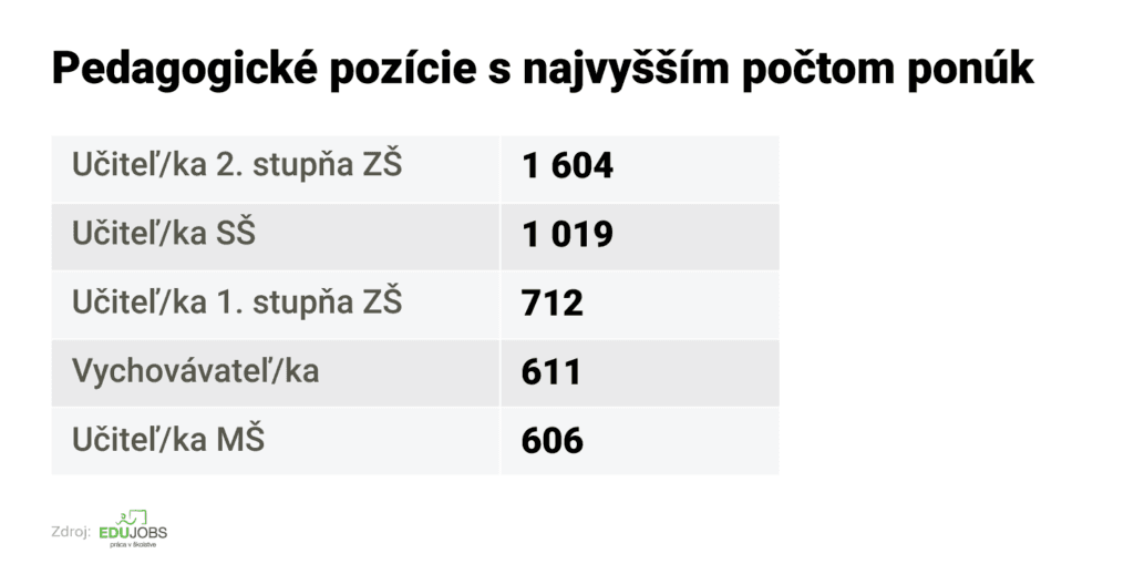 Učiteľky a učitelia 2. stupňa základných škôl. Toto sú aktuálne najžiadanejší ľudia v školstve naprieč celým Slovenskom. Vlani uverejnili školy viac ako 1 600 ponúk na túto pozíciu. Vysoký dopyt je tiež po učiteľoch a učiteľkách na stredných školách a na 1. stupni základných škôl.