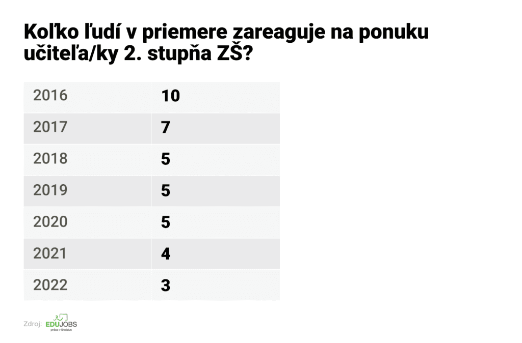Čísla však jasne ukazujú, že kým počet ponúk na túto pozíciu neustále rástol, úplne opačný vývoj mal priemerný počet reakcií uchádzačov a uchádzačiek. Kým v roku 2016 platilo, že na jeden pracovný inzerát na učiteľa či učiteľku 2. stupňa zareagovalo v priemere 10 ľudí, vlani to boli iba traja kandidáti.