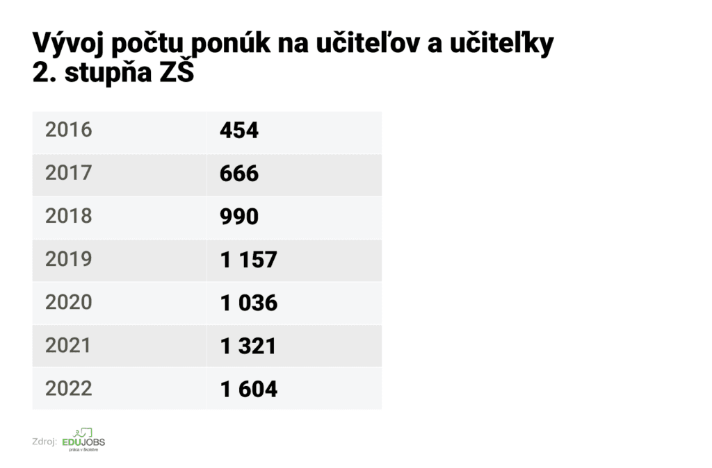 Pozícia učiteľov a učiteliek 2. stupňa na základných školách bola najinzerovanejšou nielen vlani. Tento trend platí dlhé roky. Analýza portálu Edujobs.sk ukazuje, že dopyt po ľuďoch na túto pozíciu rastie kontinuálne takmer každý rok.