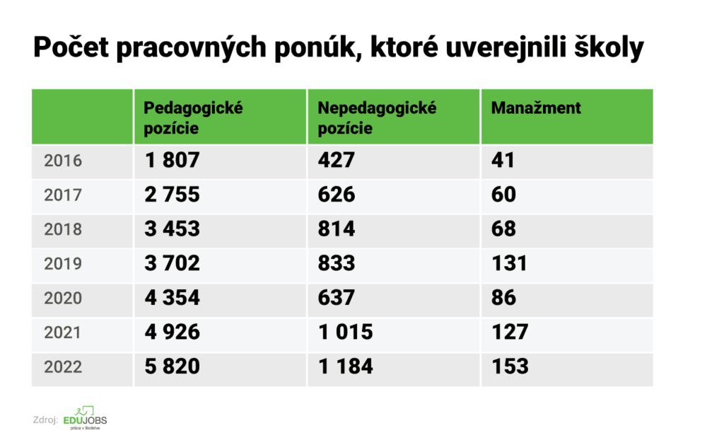 Vlaňajšok priniesol rekord školám v počte pedagogických, nepedagogických aj manažérskych ponukách práce. Najviac pracovných príležitostí je dostupných na učiteľských pozíciách. Takýchto inzerátov bolo vlani 5 820. Oproti roku 2021 narástol počet inzerátov o viac ako 18 percent.