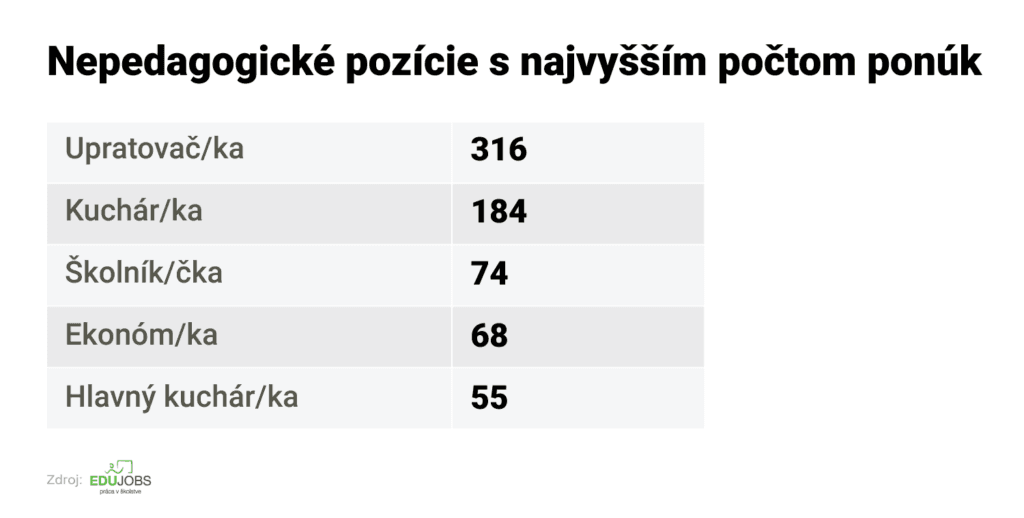Slovenské školy uverejňujú stále viac ponúk nielen na pedagógov, ale aj zamestnancov, ktorí zabezpečujú iné veci, ako je učenie. Portál Edujobs.sk zaznamenal vlani 1 184 takýchto inzerátov. Najčastejšie išlo o upratovačov/ky, kuchárov/ky a školníkov/čky.