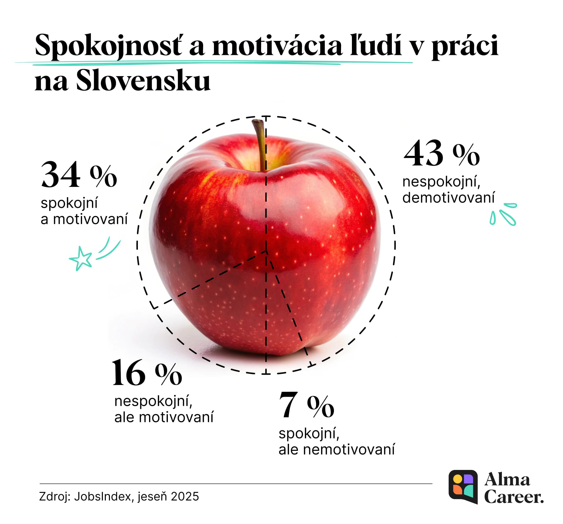Pozitívne sa v poslednom období nevyvíjala ani spokojnosť ľudí s ich prácou. Podľa prieskumu medzi zamestnancami JobsIndex, ktorý pravidelne vykonáva spoločnosť Alma Career, podiel spokojných a motivovaných ľudí vo firmách opäť mierne klesol. Aktuálne tvorí len približne tretinu (34 %) zamestnancov. Taktiež už dva roky klesá podiel všetkých motivovaných zamestnancov a v čerstvej vlne prieskumu dosahuje najnižšiu hodnotu nameranú počas doby meraní, a to len 50%.