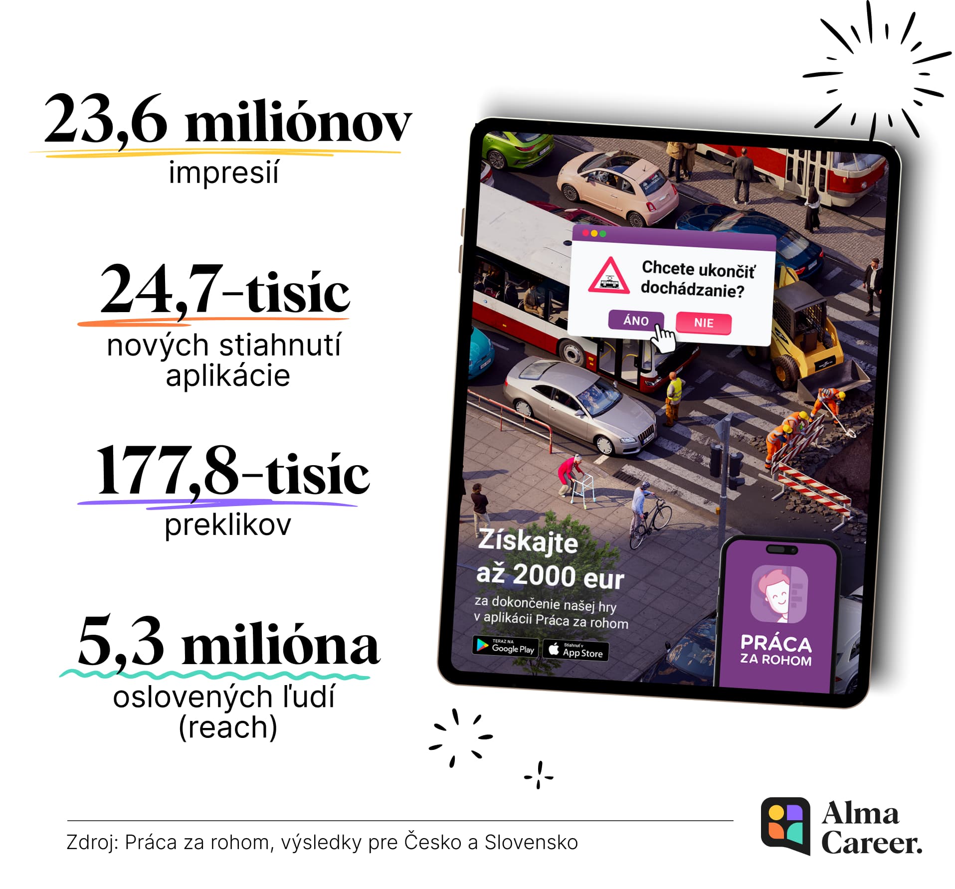 Na Slovensku sme okrem toho realizovali aj prieskum znalosti značky Práca za rohom. Skúmali sme, ako určité skupiny vnímajú aplikáciu, ako ich vnímanie ovplyvnila spomínaná kampaň a ako sa menila ich motivácia stiahnuť si aplikáciu do mobilu. Výsledky ukázali, že kampaň celkovo zvýšila obľúbenosť značky Práca za rohom zo 44 % pred kampaňou na 53 % po kampani. Zvýšila tiež celkovo ochotu zvažovať aplikáciu na hľadanie práce z 8 % na 12 %.
