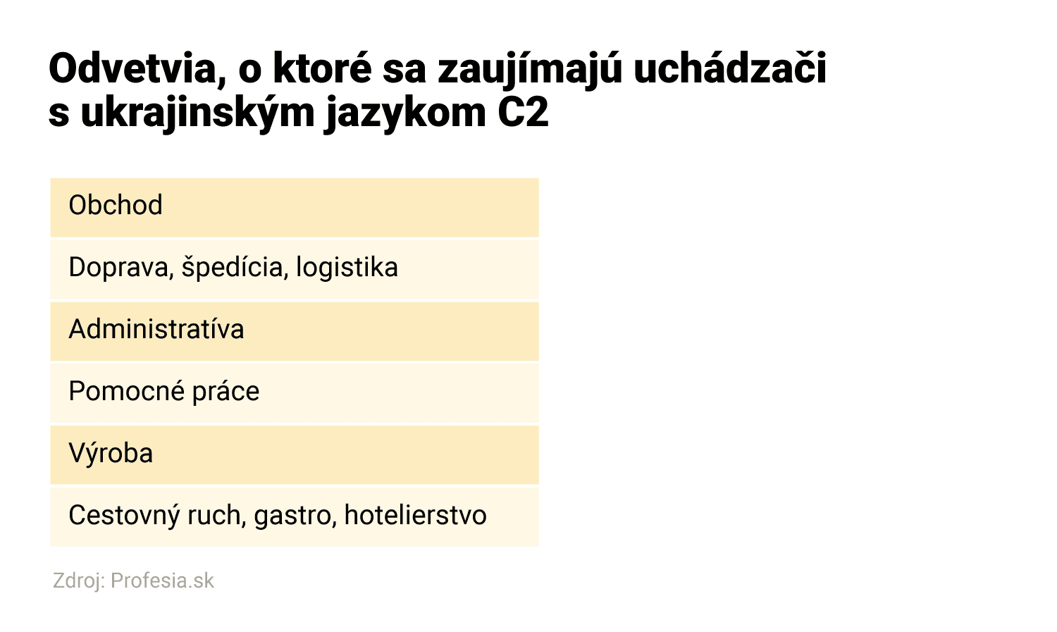 Medzi aktuálnymi uchádzačmi, ktorí si aktívne hľadajú prácu na Profesii, je zhruba 1000 ľudí, ktorí ovládajú ukrajinčinu na úrovni C2. Najväčšia časť z nich hľadá prácu v obchode, doprave, špedícií a logistike či v administratíve.