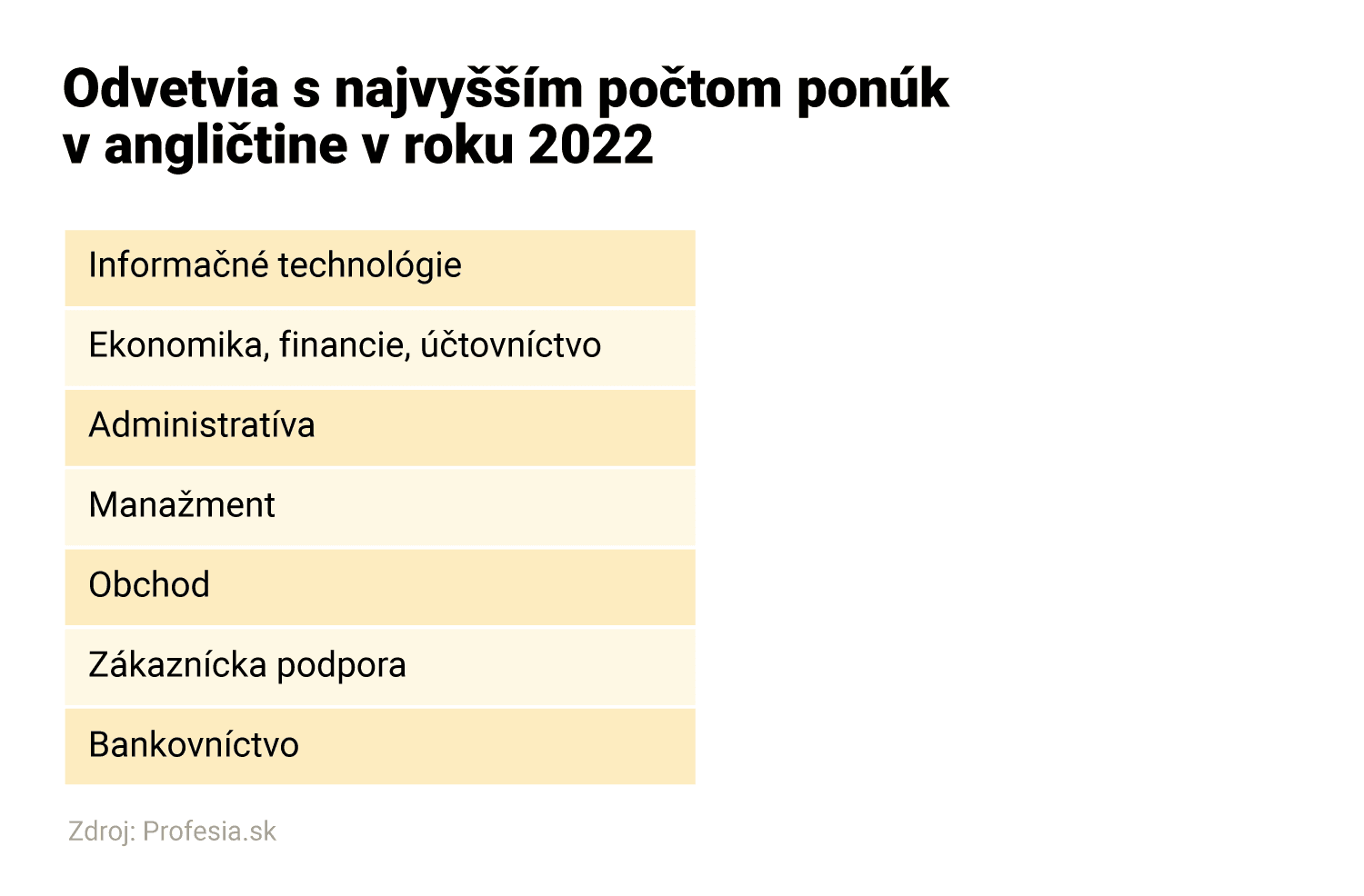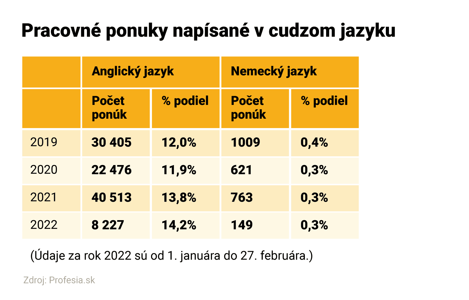 Portál Profesia.sk vo svojej analýze zisťoval, aké možnosti ponúka náš trh práce kvalifikovanej pracovnej sile, ktorá nerozpráva po slovensky. Zamestnávatelia uverejnili v roku 2022 do 27. februára viac ako 8-tisíc inzerátov, ktoré sú napísané po anglicky a neuvádzajú požiadavku ovládať miestny úradný jazyk.