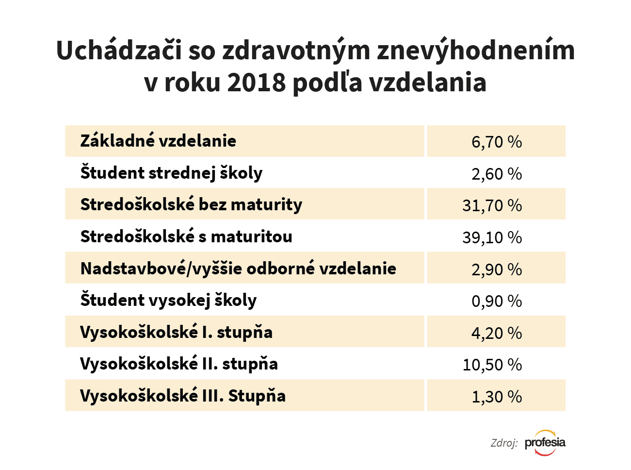 Najväčšia časť uchádzačov so zdravotným znevýhodnením má maturitné vzdelanie. Ľudia s týmto vzdelaním tvorili takmer 40 percent zo životopisov, ktorí si zdravotne postihnutí ľudia vytvorili v roku 2018.