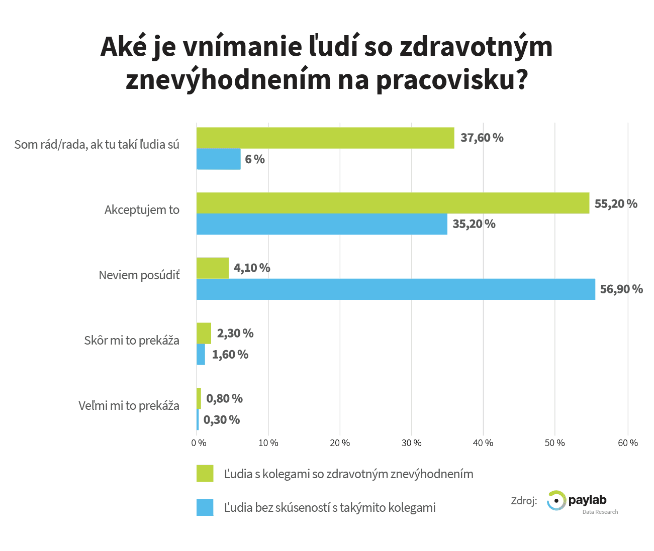 Tí, ktorí v súčasnosti majú kolegu so zdravotným znevýhodnením, označujú túto skúsenosť ako pozitívnu vo vyše 37 percent prípadov. Ak sa pozrieme na zamestnancov bez skúseností s takýmito kolegami, za pozitívum to považuje iba 6 percent ľudí.