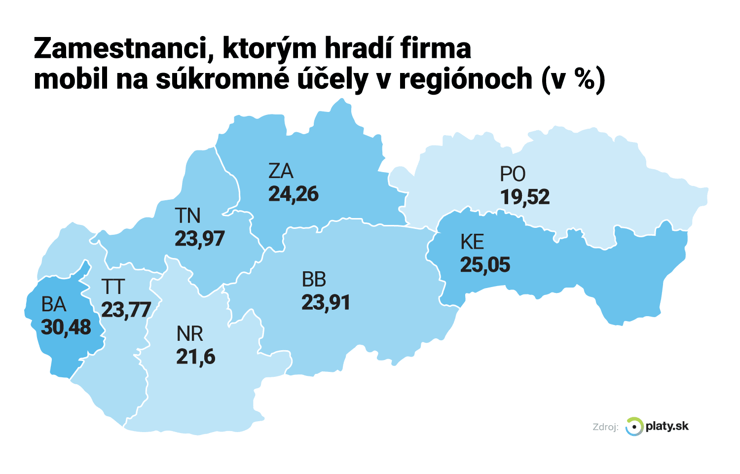 Tak, ako je to pri platoch či dostupnosti voľných pracovných miest, regionálne rozdiely vidíme aj pri rozšírenosti nefinančných benefitov. Mobil na súkromné účely je od zamestnávateľov najviac rozšírený v Bratislavskom a Košickom kraji.