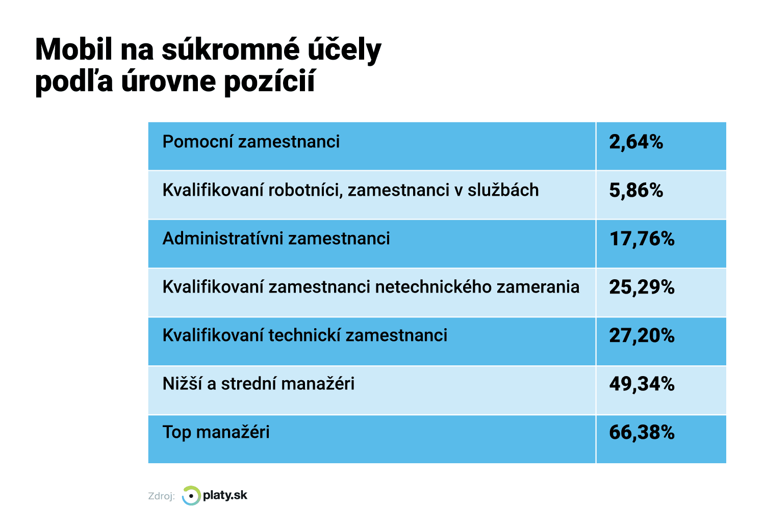 Analýza portálu Platy.sk odhalila, že na Slovensku sú iba necelé tri percentá pomocných pracovníkov, ktorí majú k dispozícii mobil na súkromné účely, ktorý im hradí ich zamestnávateľ.