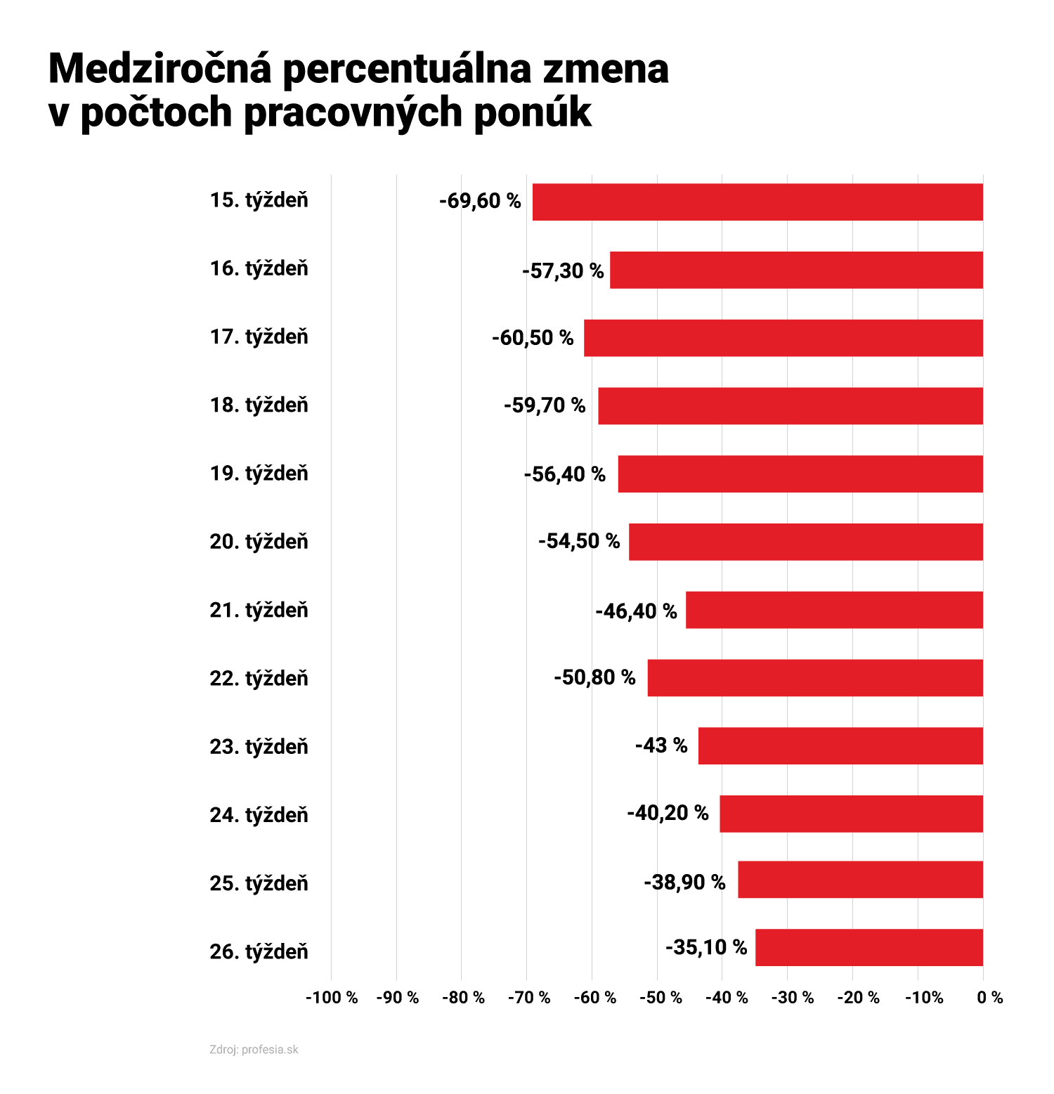 Keď porovnáme počet ponúk v poslednom týždni s rovnakým obdobím minulého roka, stále ide o prepad o 35 percent. V 26. kalendárnom týždni 2019 bolo na portáli 5032 nových pracovných ponúk.