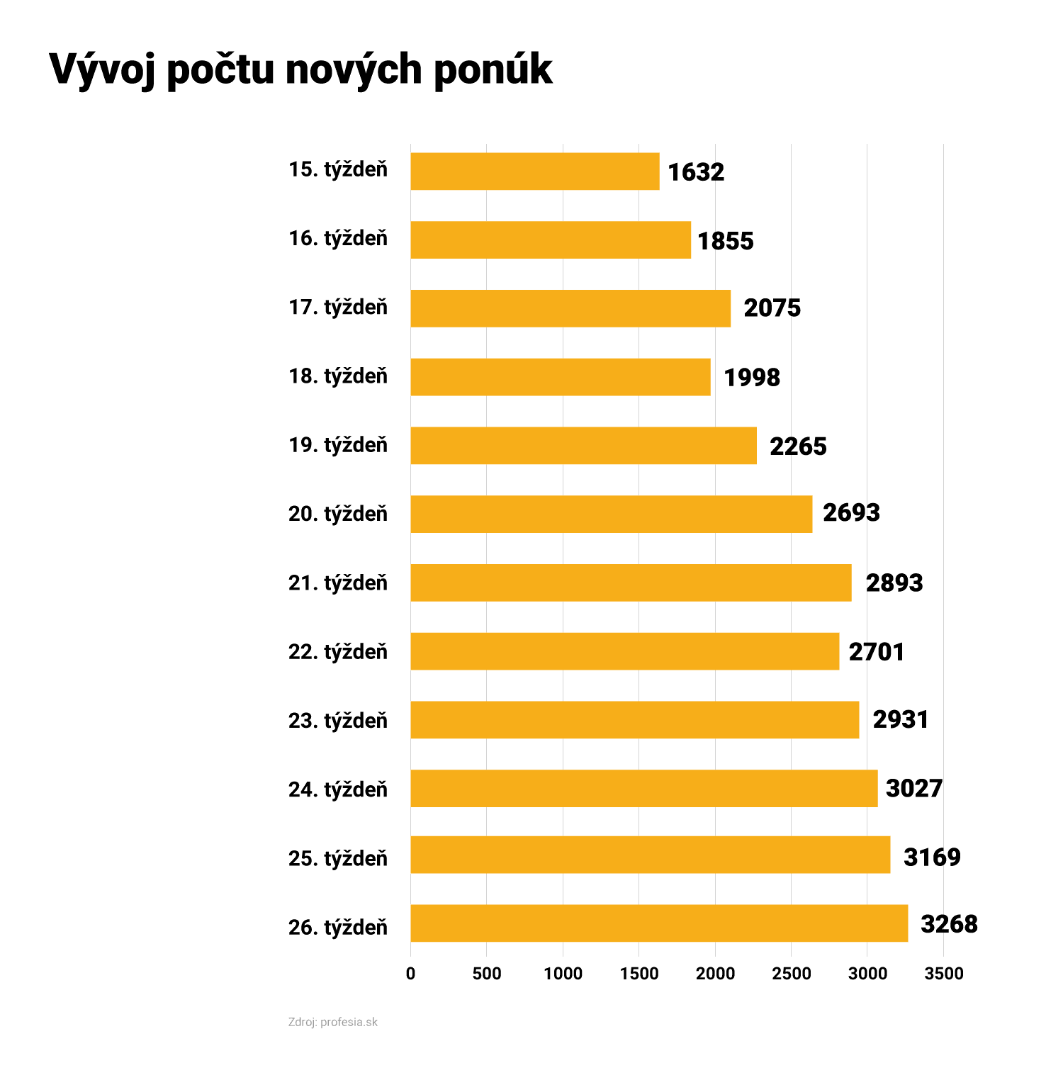 Zatiaľ najvyššie číslo bolo zaznamenané v poslednom 26. kalendárnom týždni. Od 22. do 28. júna 2020 zamestnávatelia uverejnili 3 268 nových pracovných ponúk.