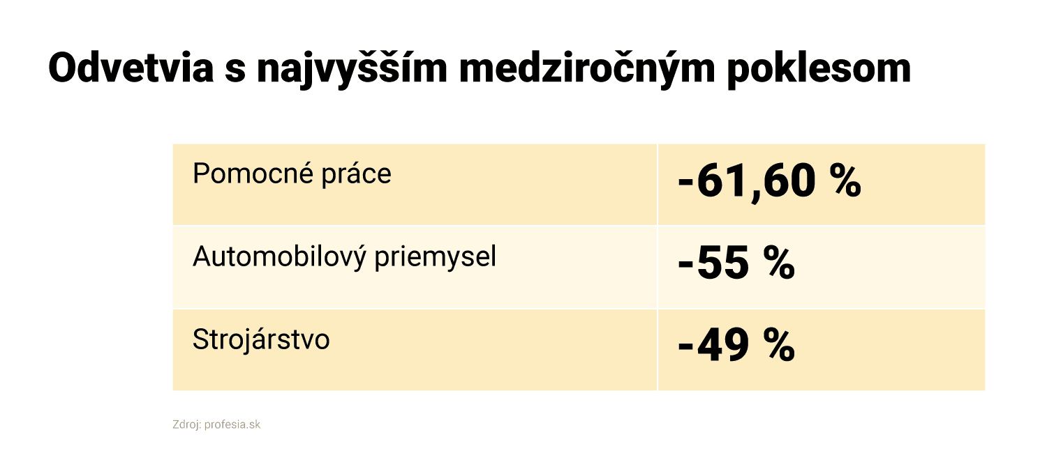 Odvetviami, pri ktorých Profesia eviduje najvýraznejší medziročný pokles počtu inzerátov sú najmä pomocné práce, automobilový priemysel a strojárstvo.