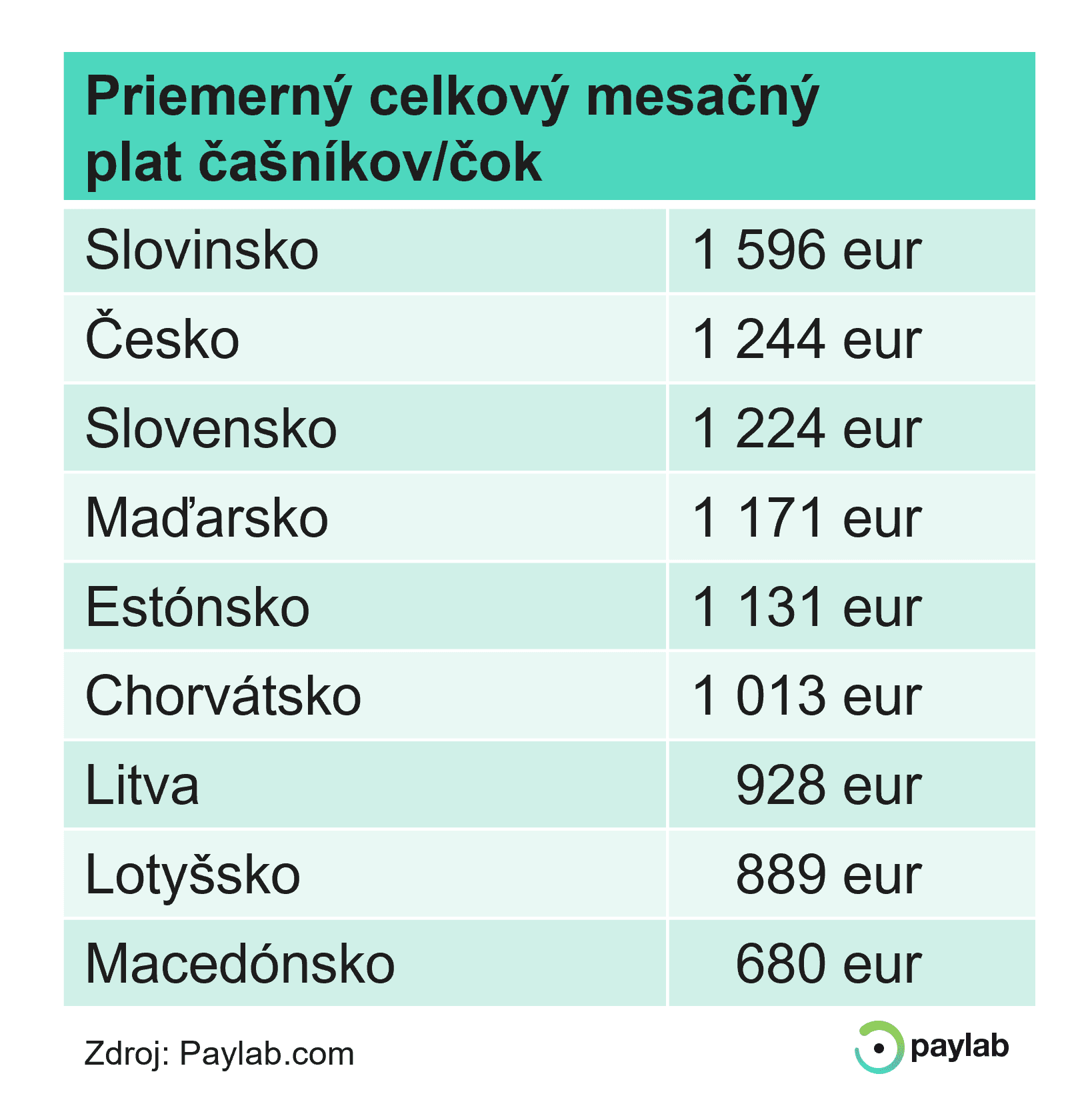 Z dát portálu Platy.sk vyplýva, že priemerný celkový mesačný zárobok, čiže vrátane 13. platu či odmien, čašníkov a čašníčok na Slovensku je 1 224 eur. Najhoršie zarábajúca desatina má mesačne do 841 eur, 10 percent najlepšie zarábajúcich má cez 1 704 eur mesačne.