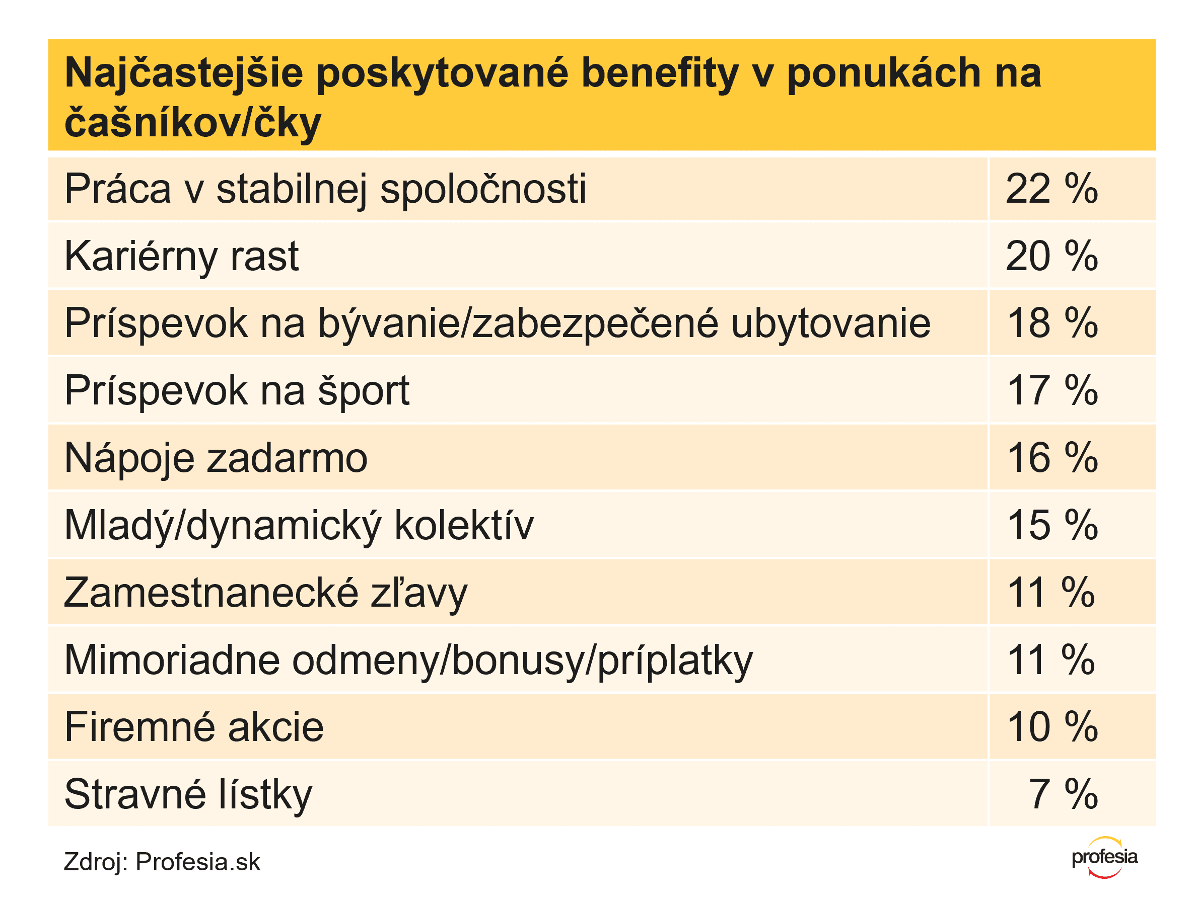Hoci sú na Slovensku najžiadanejšie benefity flexibilný pracovný čas a práca z domu, pri tejto práci sú ich možnosti veľmi obmedzené. V inzerátoch na čašníkov a čašníčky na Profesia.sk tento rok prevádzky najčastejšie uvádzajú medzi benefitmi prácu v stabilnej spoločnosti, kariérny rast, príspevok na bývanie resp. jeho zabezpečenie, príspevok na šport a nápoje zadarmo. 11 percent ponúka mimoriadne bonusy a odmeny.