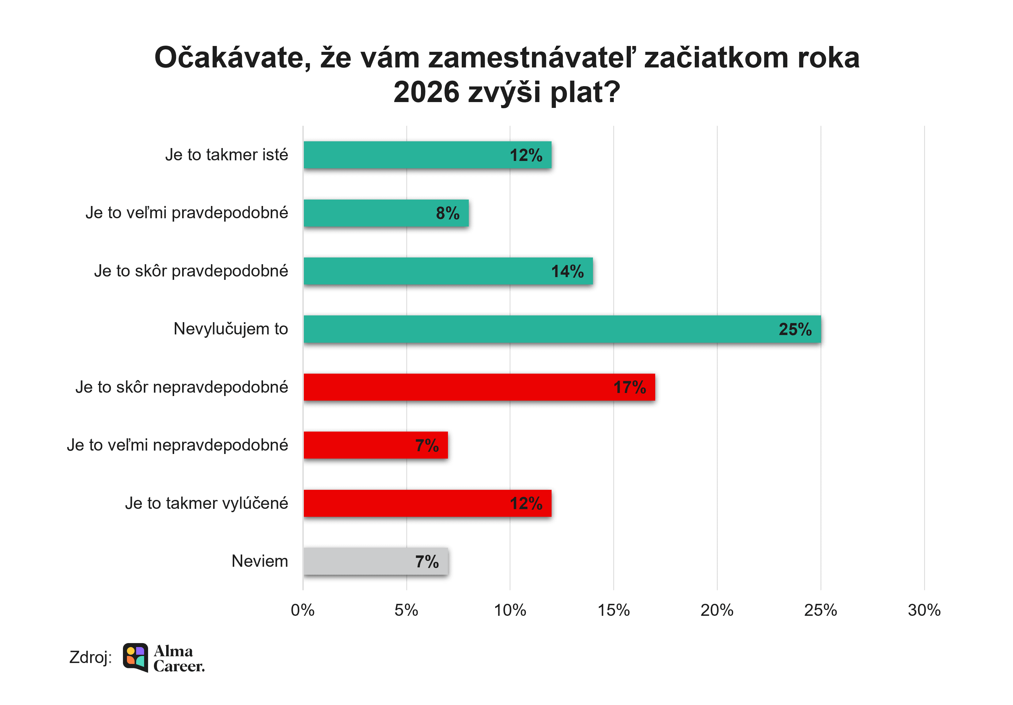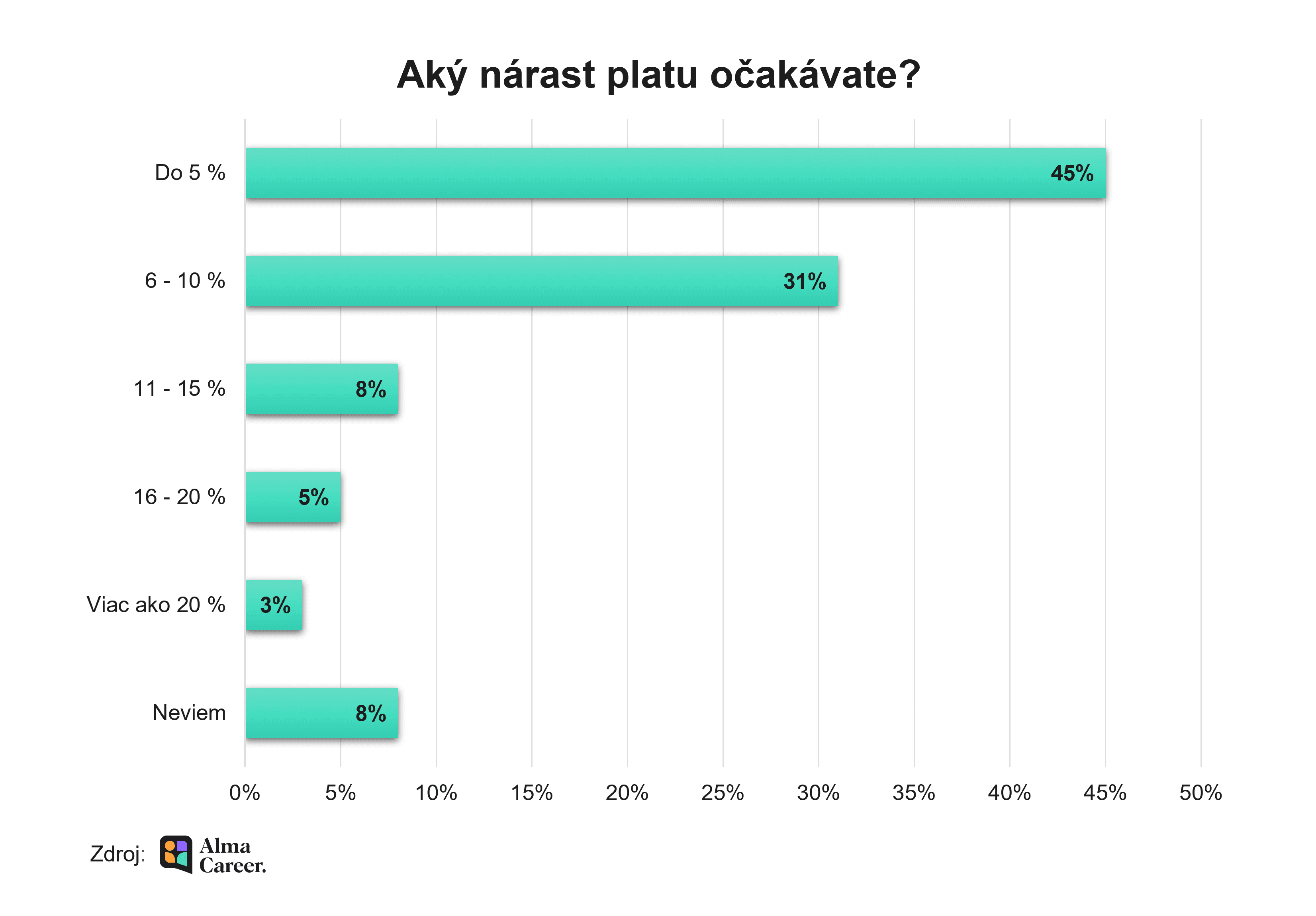 Spomedzi tých, ktorí očakávajú alebo nevylučujú, že im začiatkom budúceho roka stúpne plat, takmer polovica predpokladá, že to bude len do 5 %. Necelá tretina to vidí na 6 až 10-percentný nárast.