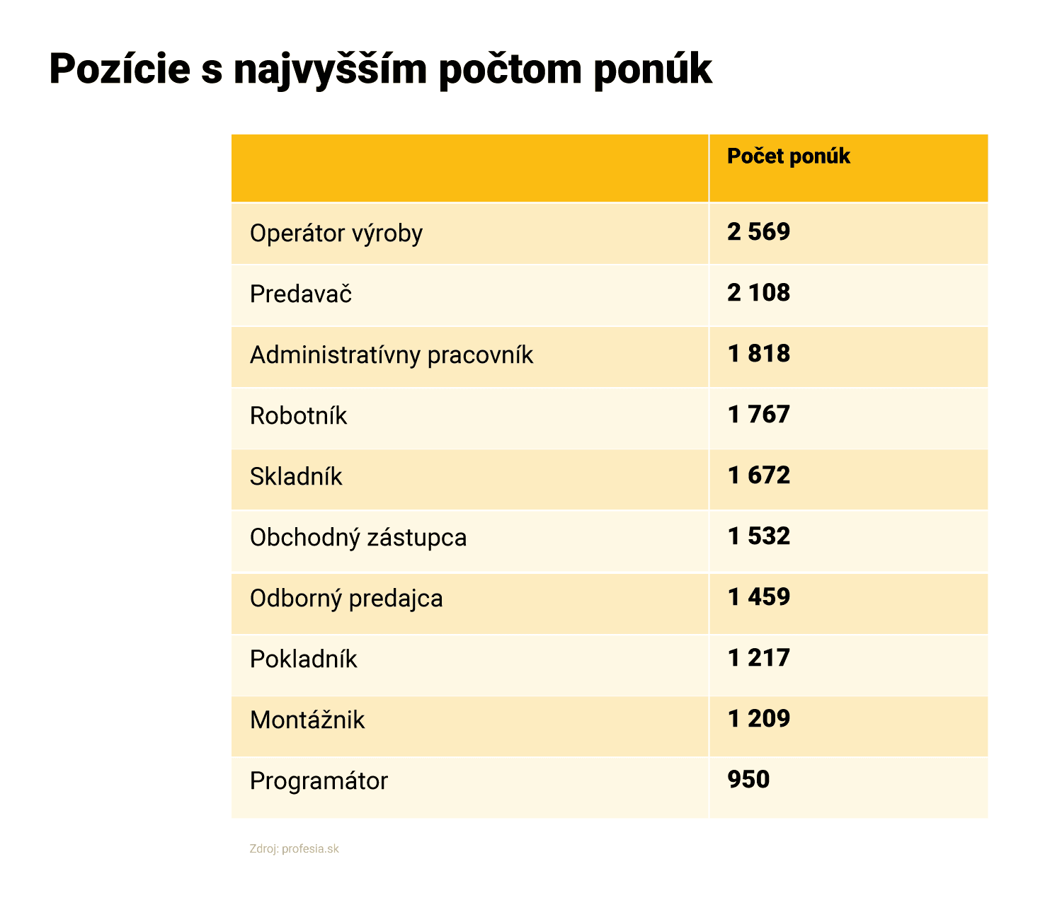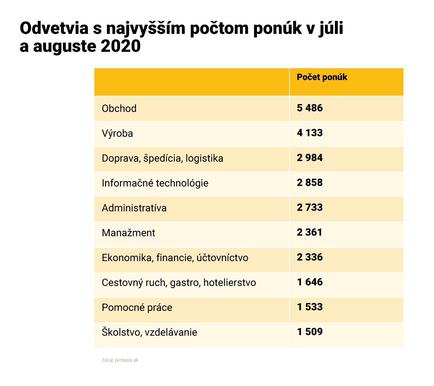 Portál Profesia.sk eviduje najviac pracovných inzerátov v obchode a vo výrobe. V období od 1. júla do 25. augusta tvorili tieto dve odvetvia až tretinu celej ponuky. Za nimi nasleduje doprava, informačné technológie či administratíva.