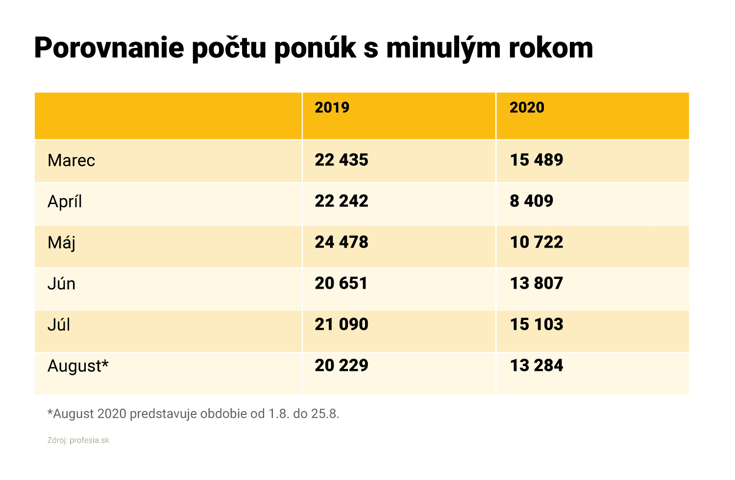 Spoločnosť Profesia uverejňuje novinky z trhu práce v súčasnej mimoriadnej situácii pravidelne. Sprístupnili sme COVID 19 Recruitment Report, ktorý je dostupný na covid.profesia.sk. Ide o týždenné údaje o počtoch nových pracovných ponúk na portáli Profesia.sk. Údaje sú aktualizované každý pondelok o ďalší ukončený týždeň. Ide o pomôcku, ktorá môže urýchliť tok informácií medzi našou spoločnosťou, zamestnávateľmi, médiami a mnohými ďalšími.