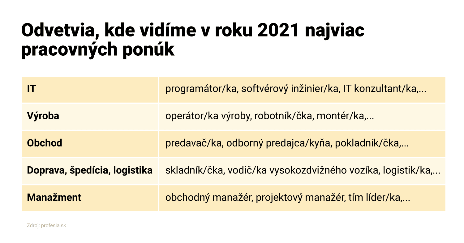 Novinkou v roku 2021 je, že ponukám práce začali výrazne dominovať IT pozície. Posledných päť rokov vždy platilo, že sektorom s najvyšším počtom ponúk bol vždy obchod. Opatrenia, ktoré nechali zatvorené obchody s nepotravinovým sortimentom, práca z domu alebo výrazná orientácia na online predaj však priniesli na trh práce zmeny.