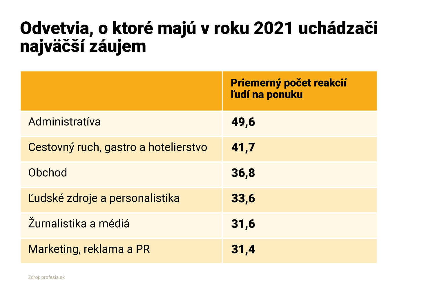 Vyšší počet ponúk prináša aktuálne lepšie možnosti pre uchádzačov. V odvetviach, o ktoré je zo strany ľudí výrazne vyšší záujem, môže byť získanie nového uplatnenia náročné. Najvyššia konkurencia medzi uchádzačmi je v roku 2021 v administratíve. Tu platí, že keď firma uverejní pracovnú ponuku, zareaguje na ňu v priemere 50 ľudí.