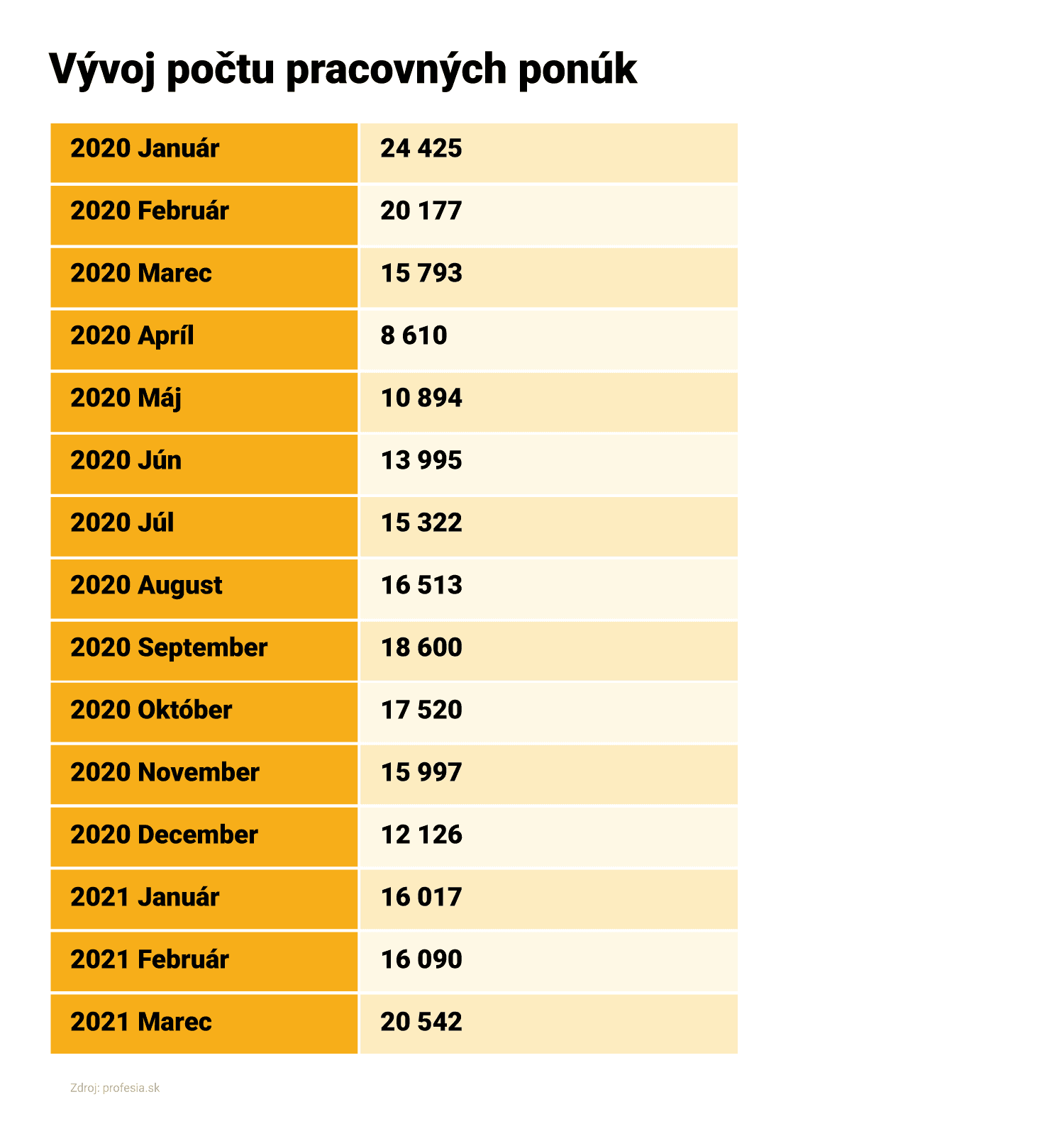 Máme za sebou najúspešnejší mesiac na trhu práce od príchodu pandémie. Najväčší pracovný portál na Slovensku Profesia.sk zaznamenal v marci 20 542 ponúk. To je o takmer 5-tisíc viac ako počet v marci minulého roka, keď Slovensko zažilo prvé proticovidové opatrenia.