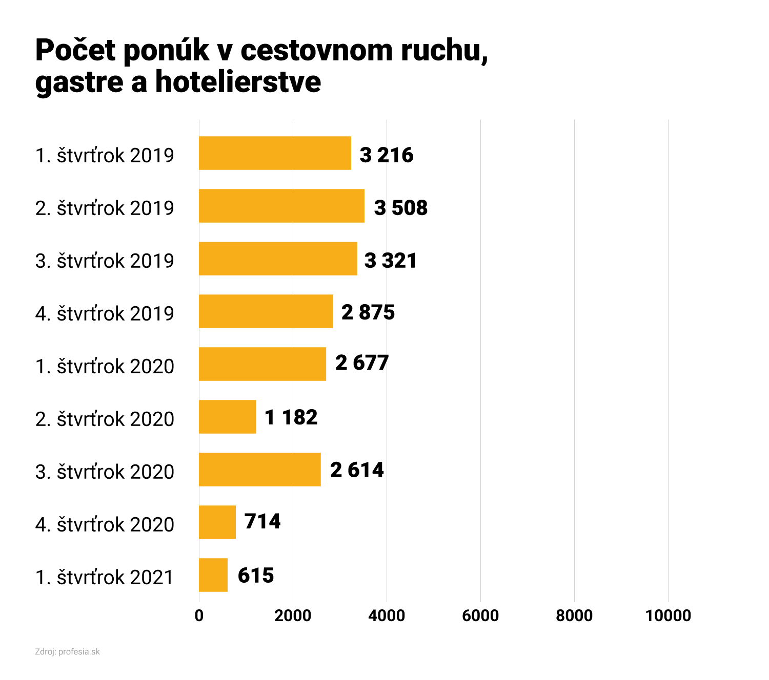 Naopak, kým ostatné odvetvia sa preberajú, cestovný ruch, gastro a hotelierstvo má za sebou historicky najhorší štvrťrok. Za prvé tri mesiace roka 2021 zaznamenala Profesia v tomto odvetví iba 615 pracovných ponúk.