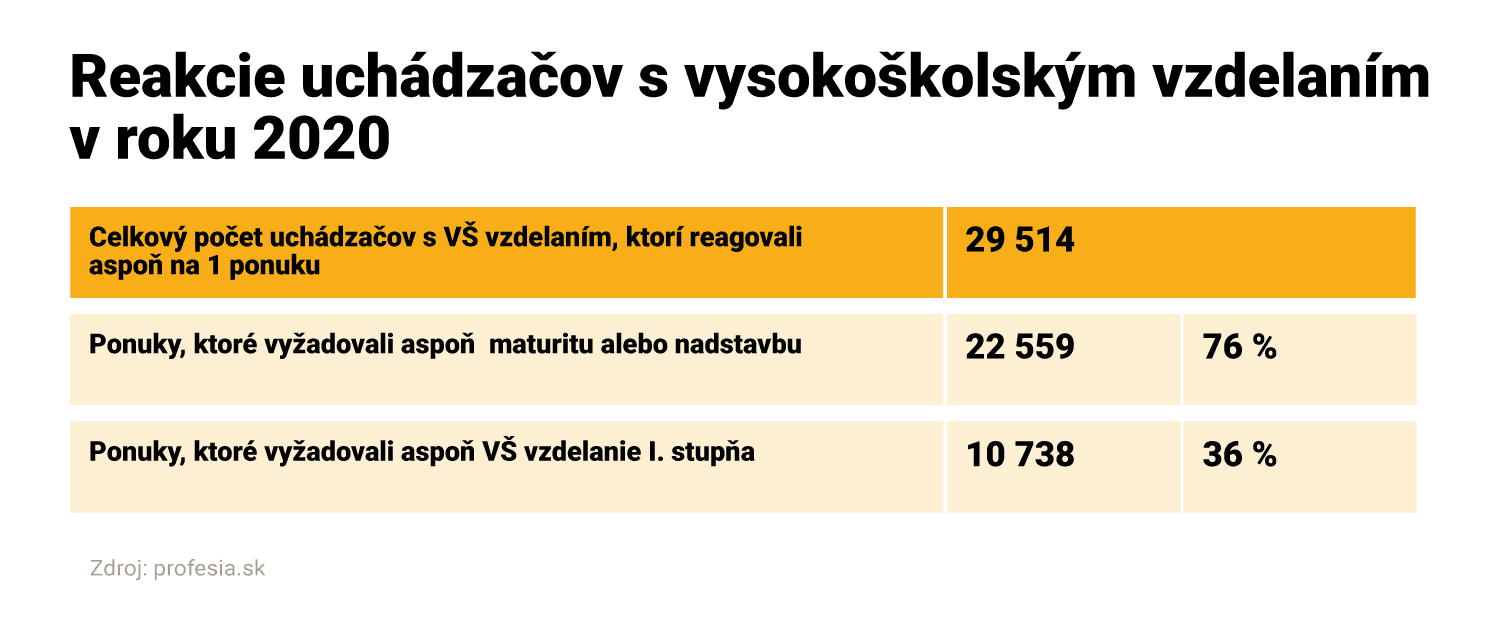 Aj to môže byť dôvod, prečo uchádzači s vysokoškolským titulom reagujú častejšie na „stredoškolské“ ponuky ako tie „vysokoškolské“. Počas 1. polroka 2020 až 76 percent vysokoškolsky vzdelaných uchádzačov zareagovalo aspoň na jednu ponuku práce, ktorá požadovala strednú školu.