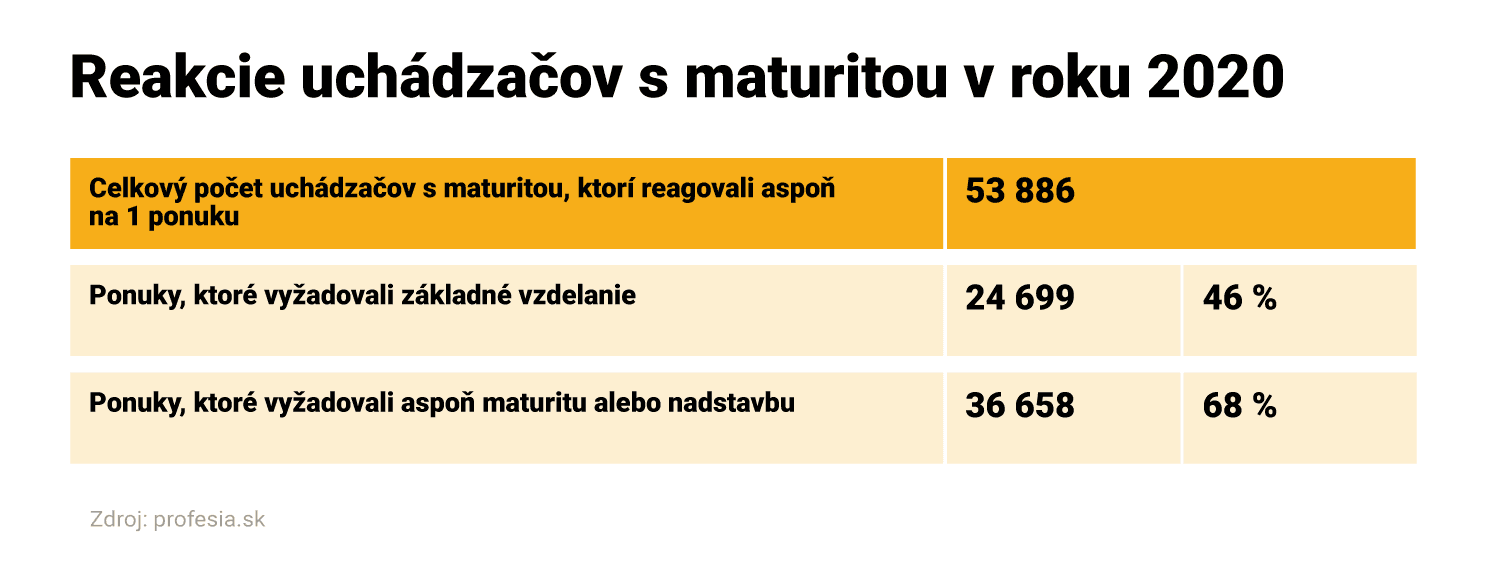 Pomerne vysoký podiel však zaznamenala Profesia aj pri uchádzačoch s maturitou, ktorí reagovali aspoň na jednu ponuku práce, na ktorú stačilo základné vzdelanie. Z celkového počtu išlo až o 46 percent.