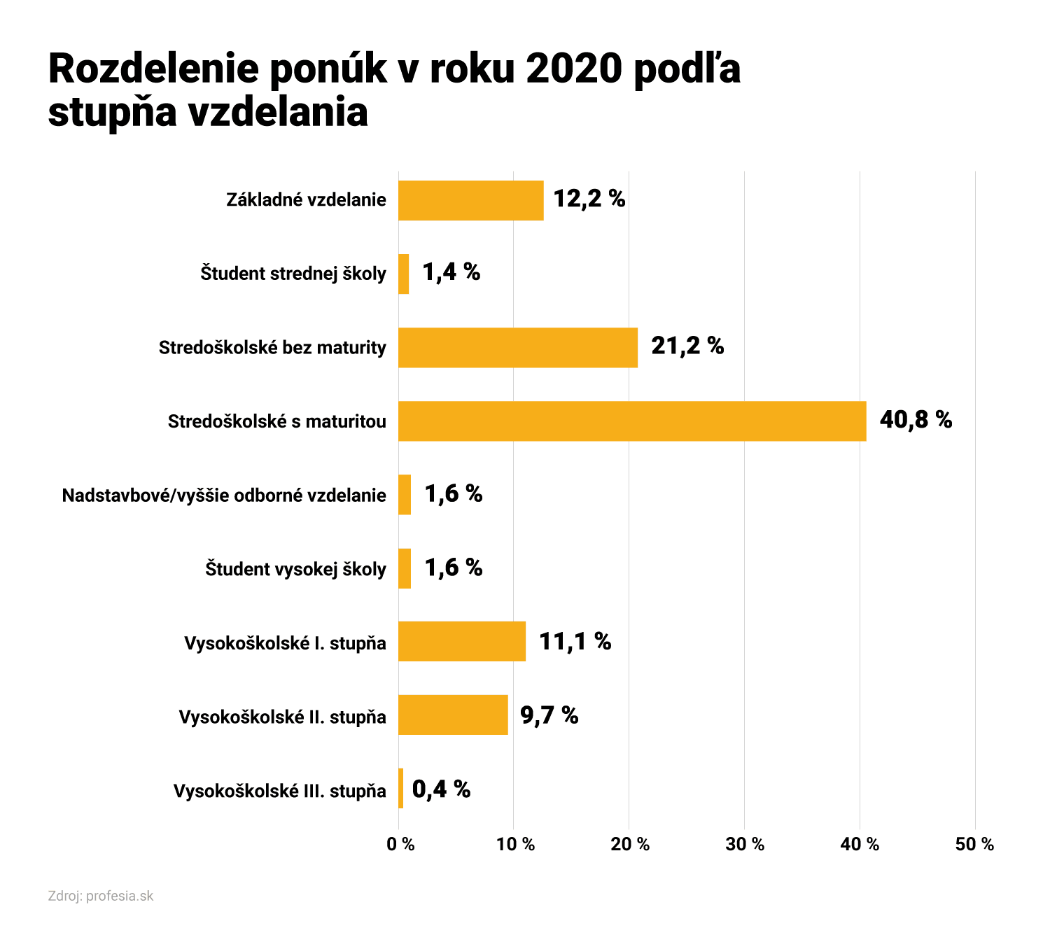 Zamestnávatelia vyžadujú najčastejšie maturitu. Z celkového počtu ide o takmer 41 percent pracovných ponúk na Profesia.sk. Druhým najčastejším požadovaným stupňom vzdelania je stredoškolské bez maturity. Tento stupeň uvádzajú zamestnávatelia v 21 percentách inzerátov.