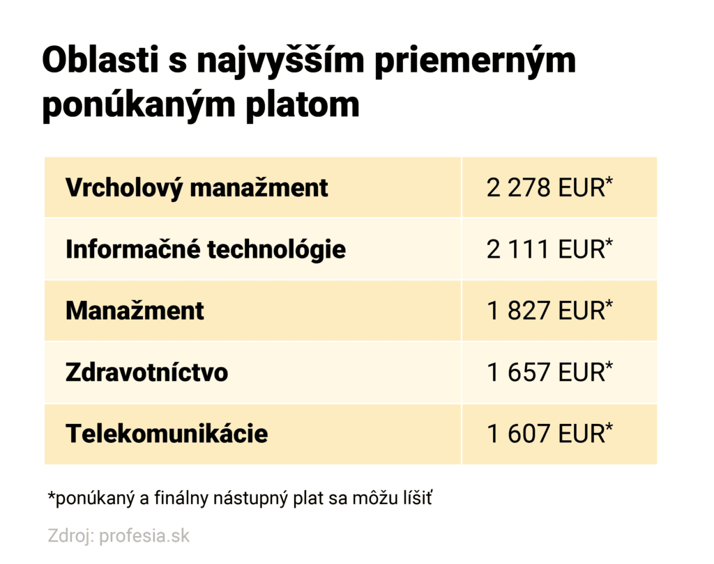 V prvých šiestich mesiacoch roka 2023 boli najvyššie ponúkané platy v oblastiach vrcholového manažmentu a informačných technológií, kde uvádzali viac ako 2200 resp. 2100 eur mesačne v hrubom. Vyše 1800 eur v priemere ponúkali v manažmente, priemerný plat nad 1600 eur uvádzali v inzerátoch v oblasti zdravotníctva a telekomunikácií.