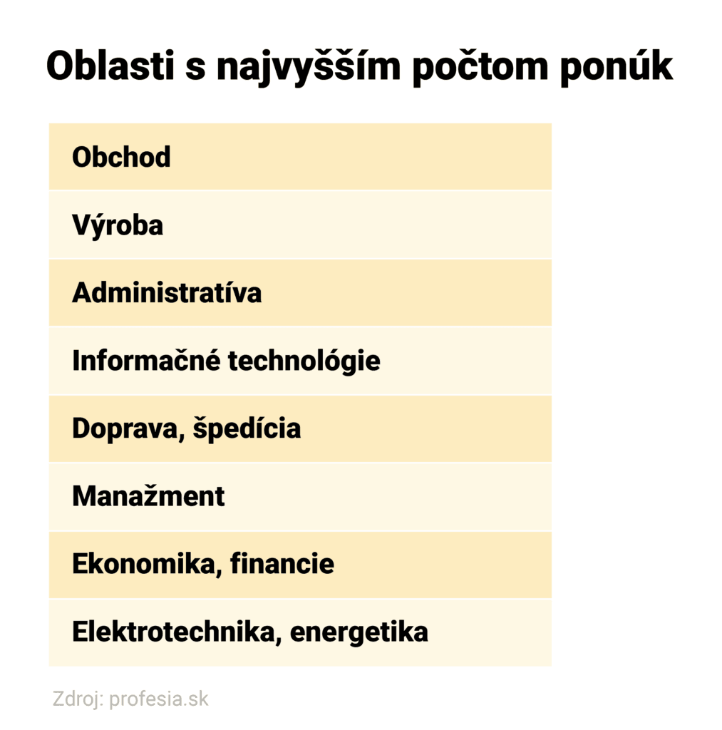 Spomedzi spomínaných viac ako 163-tisíc inzerátov bolo najviac, 19 percent, z oblasti obchodu, nasleduje výroba so 14 percentami a tretí najväčší podiel tvorili ponuky z administratívy. Takmer rovnaký počet zamestnancov hľadali aj v sektore informačných technológií, kde množstvo inzerátov každým rokom rastie.