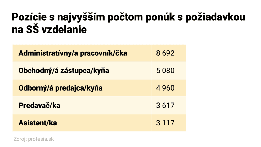 Viac ako 38 percent ponúk na Profesia.sk bolo v prvom polroku pre uchádzačky a uchádzačov, ktorí majú ukončenú strednú školu s maturitou. Vyše 8-tisíc bolo na pozíciu administratívnych pracovníkov, nasledujú obchodní zástupcovia a v takmer 5-tisíc inzerátoch firmy hľadali odborných predajcov.