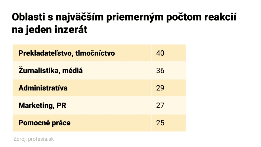 Hoci bolo na Profesia.sk v prvom polroku 2023 len 245 ponúk z oblasti prekladateľstva a tlmočníctva, záujemcovia na ne reagovali najviac. V priemere prišlo 40 reakcií na jeden takýto inzerát. Veľký dopyt bol zo strany uchádzačov aj o pozície v oblasti médií, kde bol priemerný počet reakcií 36.