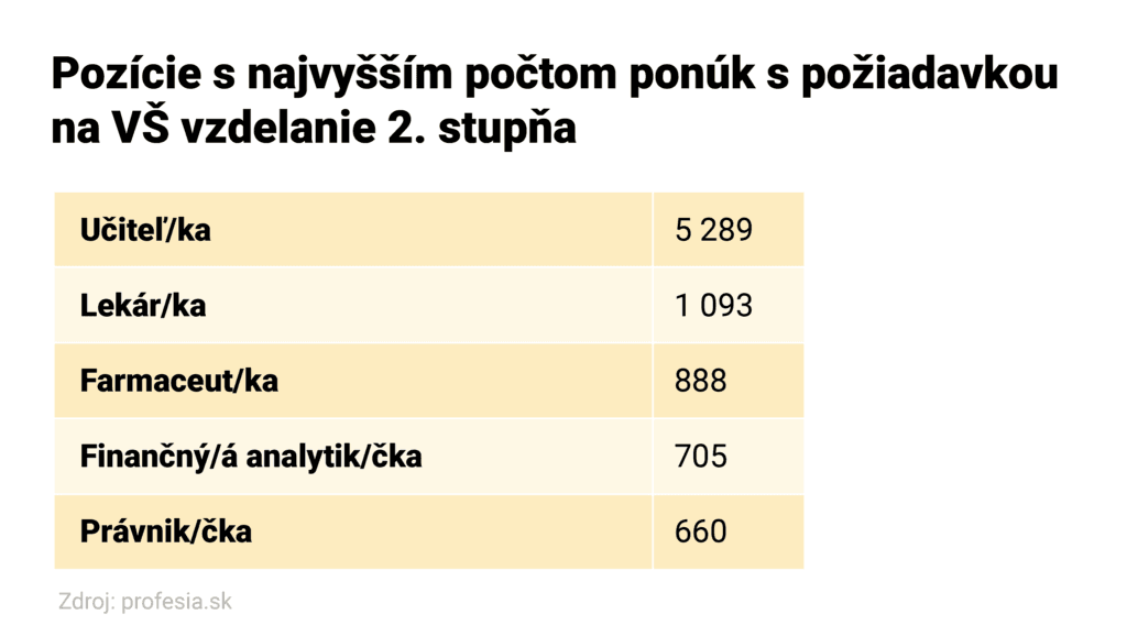 Nedostatok pedagogických pracovníkov je stále veľký a budeme sledovať vývoj aj smerom k začiatku nového školského roka. Viac ako 40 percent pracovných ponúk na Profesia.sk, v ktorých spoločnosti hľadali ľudí s vysokoškolským vzdelaním 2. stupňa, bolo z oblasti školstva. Do škôl hľadali takmer 5 300 učiteľov a učiteliek. Tvorili skoro tretinu všetkých ponúk pre túto skupinu uchádzačov.