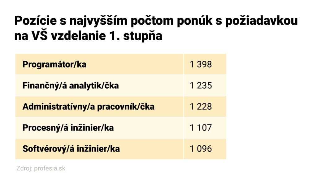 Desať percent tvorili inzeráty, v ktorých bola podmienka ukončenie vysokoškolského vzdelania 1. stupňa. Tam bol najväčší dopyt po pracovníkoch z IT sektora, konkrétne programátoroch a programátorkách. Firmy tiež hľadali finančných analytikov a administratívnych pracovníkov. V takmer siedmich percentách prípadov hľadali spoločnosti procesných a softvérových inžinierov a inžinierky.
