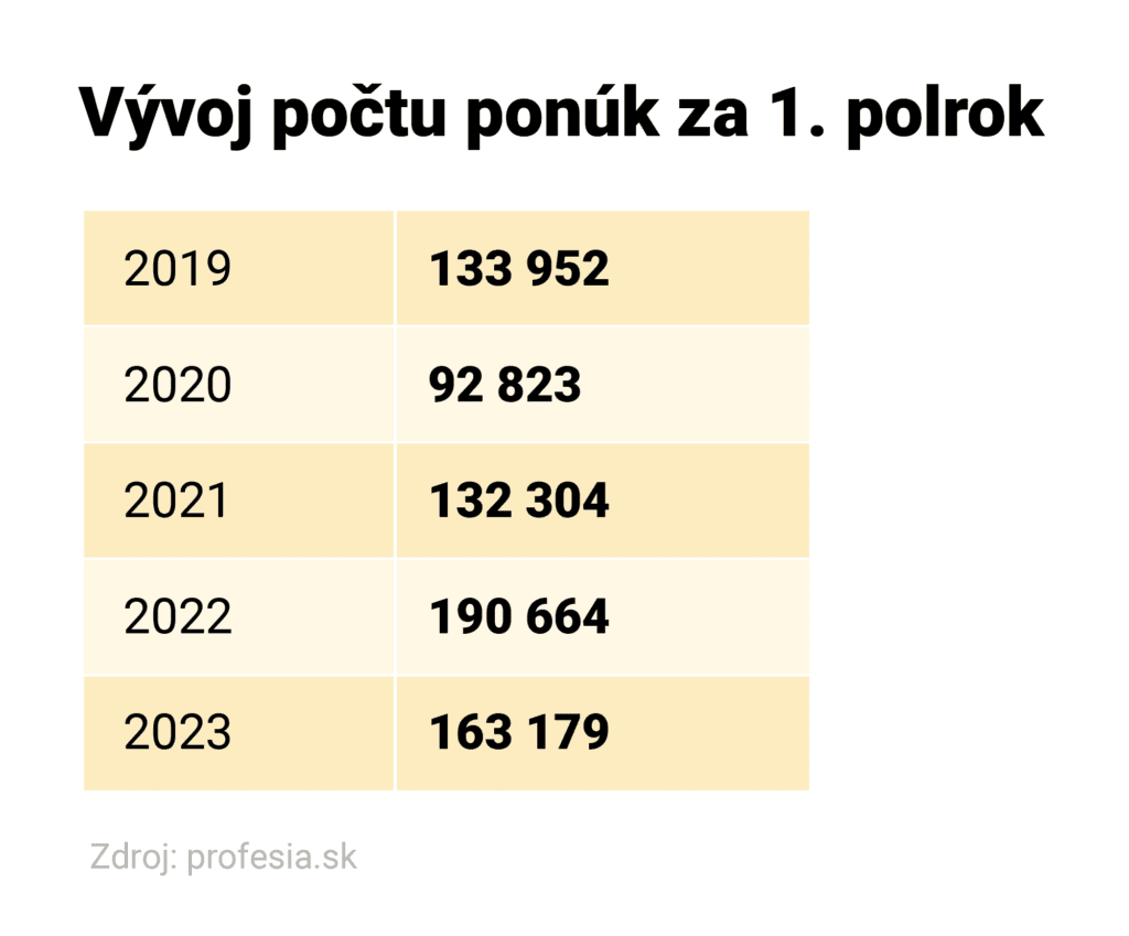 Najviac pracovných ponúk v prvom polroku bolo na Profesia.sk vlani, keď spoločnosti uverejnili viac ako 190-tisíc inzerátov, tento rok to bolo o 27-tisíc menej, no stále je to druhý najvyšší počet v histórii. Takmer 68 percent ponúk vyžadovalo prax a 69 percent inzerátov malo ako podmienku uvedenú znalosť anglického jazyka.