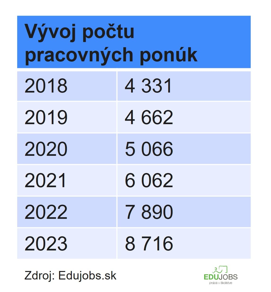 Prvýkrát sa počet pracovných ponúk na Edujobs.sk vyšplhal cez 8-tisíc, školy zverejnili v roku 2023 spolu 8716 inzerátov, čo je oproti roku 2022 10-percentný nárast. V porovnaní s rokom 2018 sa dopyt zdvojnásobil.