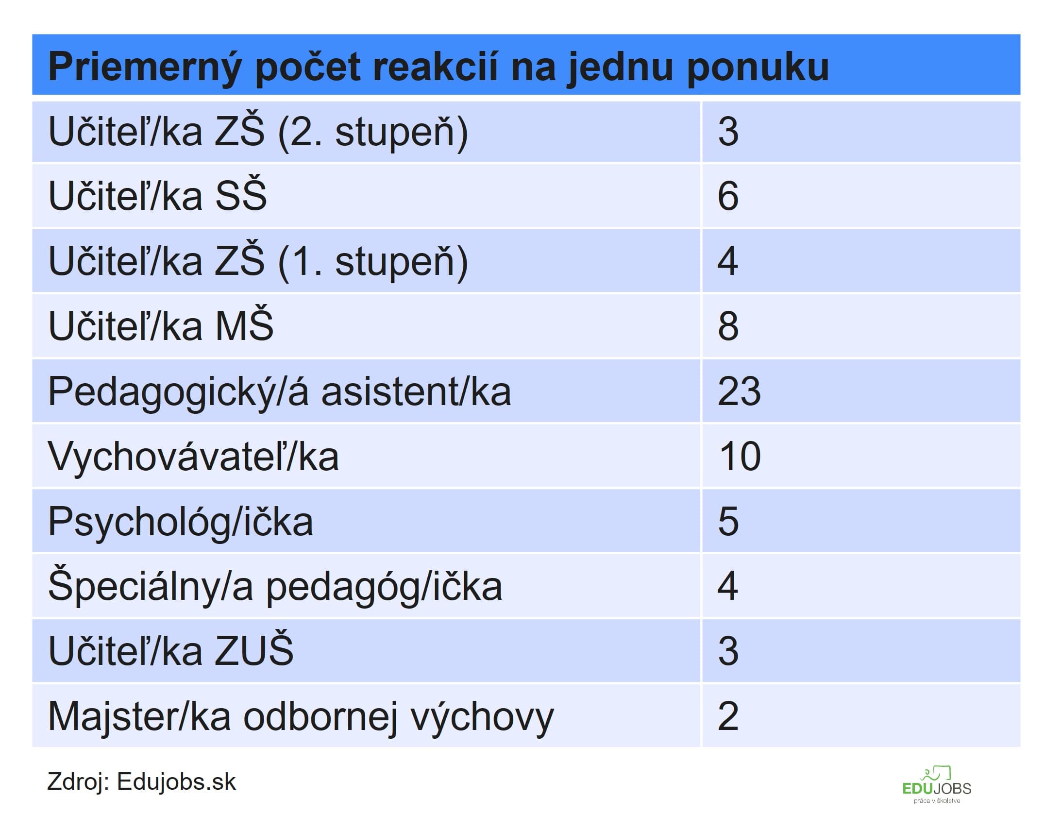 Spomedzi najdopytovanejších pozícií je zo strany uchádzačiek a uchádzačov najväčší záujem o prácu vychovávateliek/vychovávateľov. Na jednu takúto ponuku reagovalo v priemere 10 ľudí, o učenie v materských školách prejavilo záujem v priemerne osem uchádzačiek/uchádzačov.