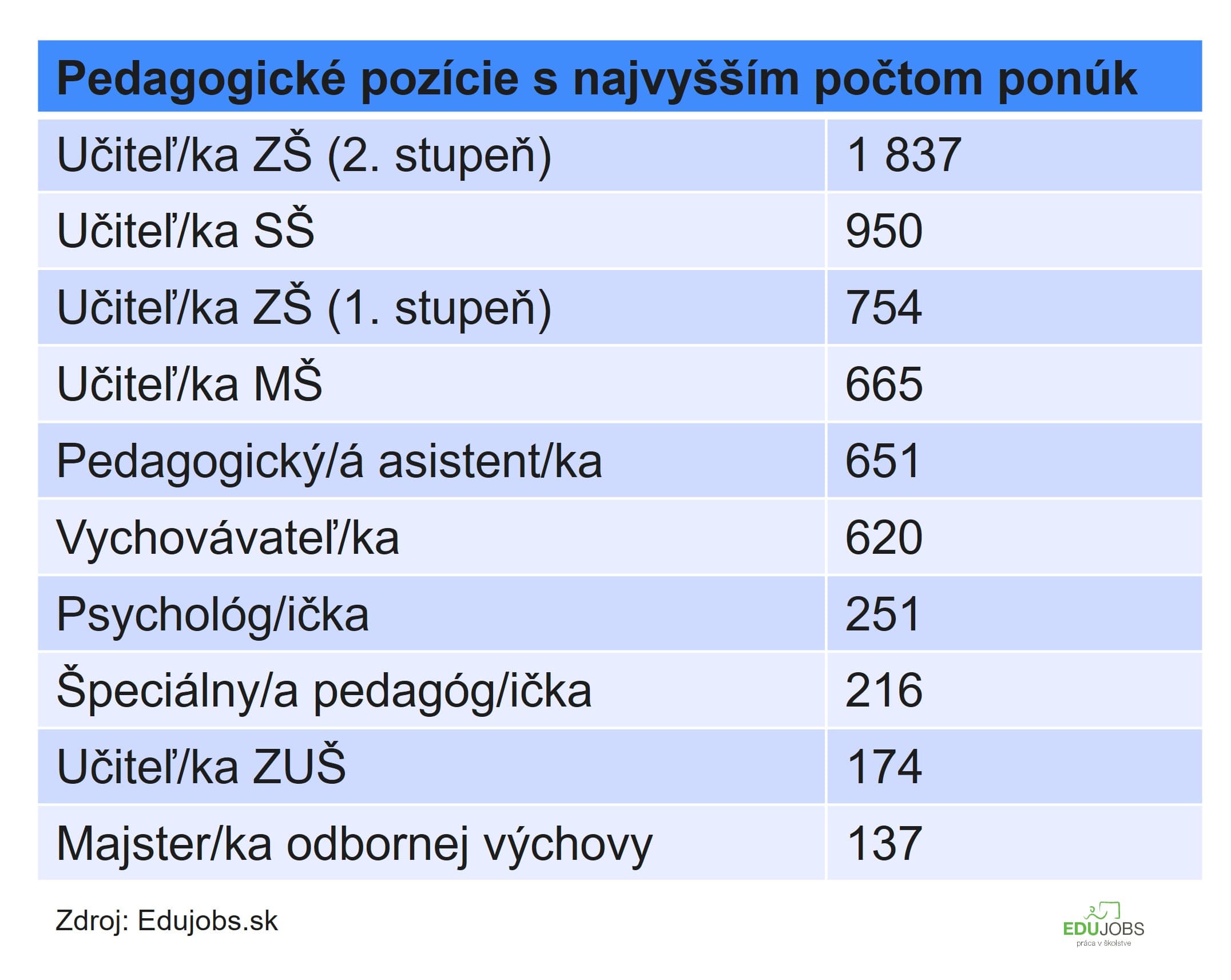 Spomedzi spomínaných viac ako 8700 ponúk bolo až 6638 na pedagogické pozície, a aj to je najvyšší počet v histórii portálu, o takmer 400 viac ako rok predtým. Školy najčastejšie hľadali učiteľov a učiteľky na 2. stupeň základných škôl (1837 inzerátov), na stredné školy (950 inzerátov) a na 1. stupeň základných škôl (754 inzerátov).